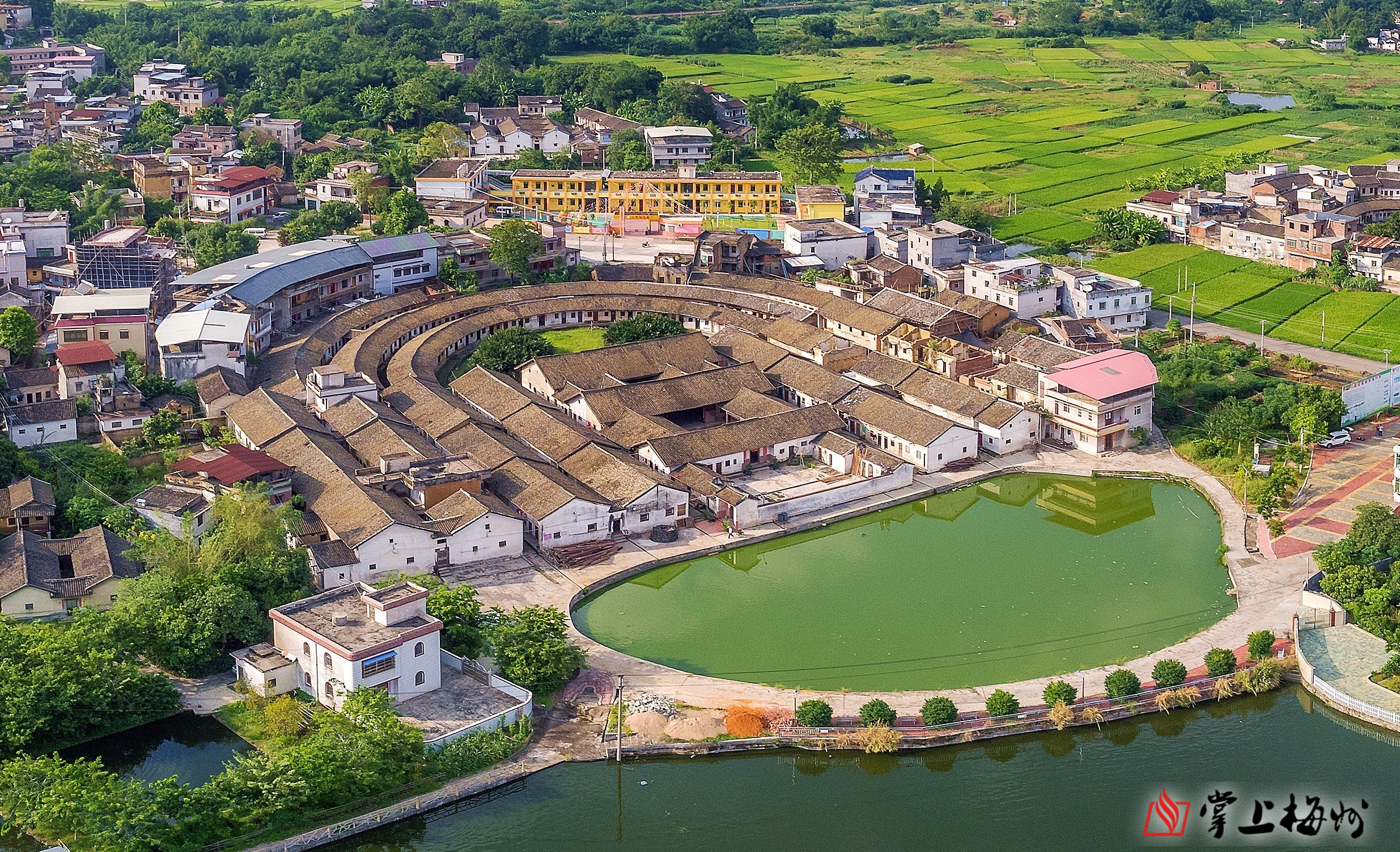 客家先民从中原一路南下,最终定居在梅州后发展出围龙屋,是“中国五大特色民居”之一。围龙屋一般选址靠山近水向阳,屋前是半月形水塘,房屋主体为前方后圆的独特形制,建筑核心为方形厅堂,厅堂两侧有可以扩展的横屋,院落的后部为逐步升高的半圆形“化胎”和围屋。围龙屋内家族聚居、世代传承,蕴含了“天人合一”“聚族而居”等寓意。在梅州,典型的客家围龙屋有丘逢甲故居、张弼士故居光禄第、仁厚温公祠、兴宁磐安围、南华又庐、新联大夫第(牛角屋)等。
