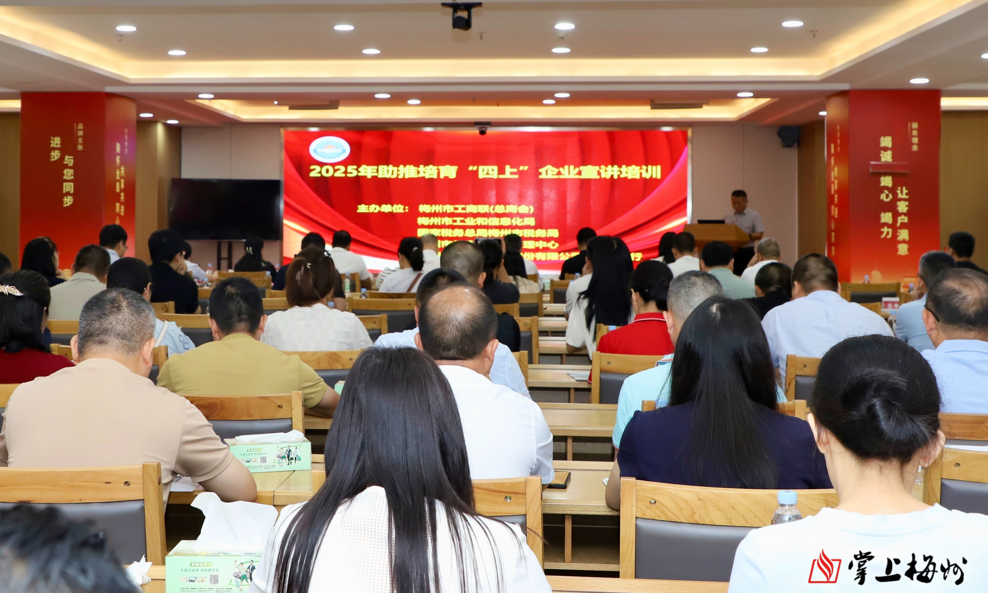 市工商联、市工信局、市税务局、市公积金管理中心、邮储银行梅州分行的相关业务负责同志,市工商联常执委企业、直属商协会拟培育“四上”企业代表共80多人参加活动。