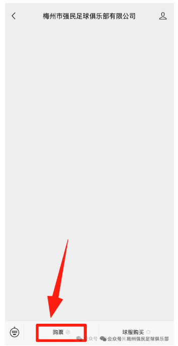 2.关注公众号“梅州市强民足球俱乐部有限公司”,在发消息页底部菜单栏点击“购票”进入通道。