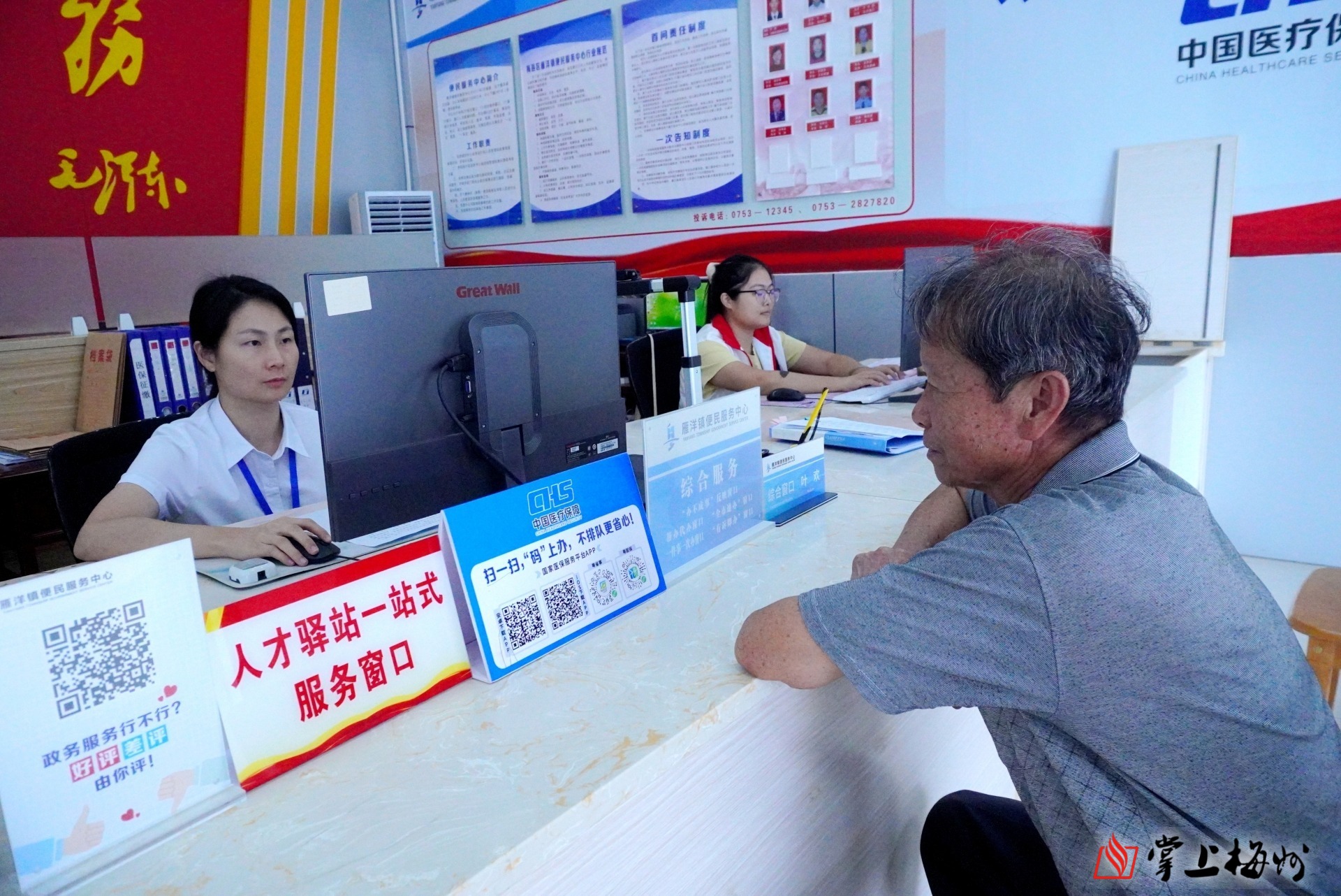 记者在梅县区雁洋镇的医保服务站看到,柜台上清楚展示了提供的医保经办服务。在这里,附近群众可以办理35项医保高频经办业务和咨询事项。大厅里还配备了一台“粤智助”政府服务自助机,方便群众自助办理医保等各类业务。“平时有老人因为不熟悉智能设备办理业务困难来咨询,我们会指导他们操作,确保他们能够顺利办理。”雁洋镇医保服务站的工作人员叶欢介绍道,对于一些行动不便的特殊人群,工作人员还会上门服务,让他们足不出户就能享受到医保服务。