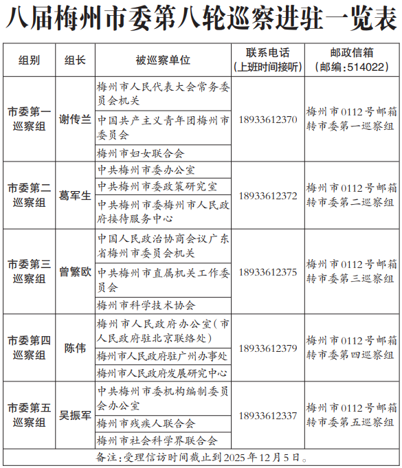 掌上梅州讯 根据市委巡察工作部署,八届梅州市委第八轮巡察将对15个市直单位党组织开展常规巡察,第四轮县级交叉巡察对8个县(市、区)党委办公室、政法委员会共16个单位党组织开展异地巡察。近日,5个市委巡察组和8个县级交叉巡察组已全部完成进驻。