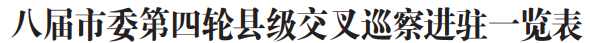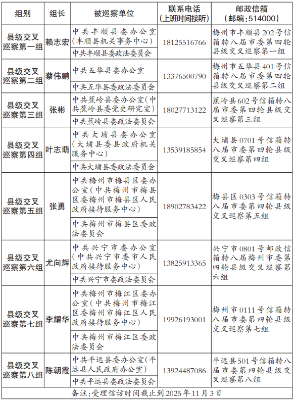 第八轮巡察时间为2025年9月上旬至12月上旬;第四轮县级交叉巡察时间为2025年9月上旬至11月上旬。巡察期间,设立专门值班电话和邮政信箱,主要受理反映被巡察党组织领导班子及其成员、下一级党组织主要负责人和重点岗位人员问题的来信来电来访,重点是关于违反政治纪律、组织纪律、廉洁纪律、群众纪律、工作纪律和生活纪律等方面的举报和反映。市委巡察组受理信访时间截止到2025年12月5日;县级交叉巡察组受理信访时间截止到2025年11月3日。