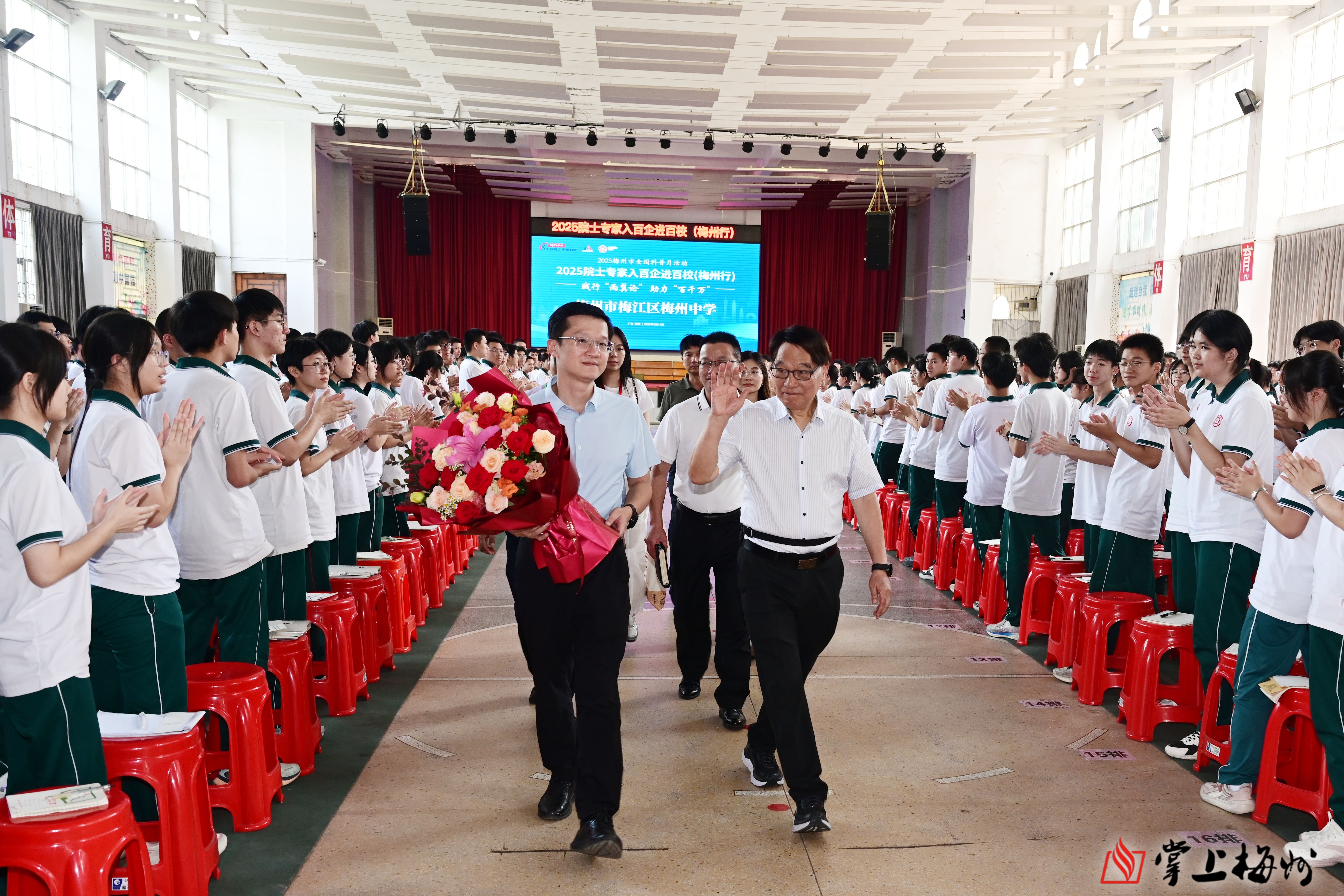 陈新滋院士向梅州中学学生挥手示意。(钟小丰 摄)