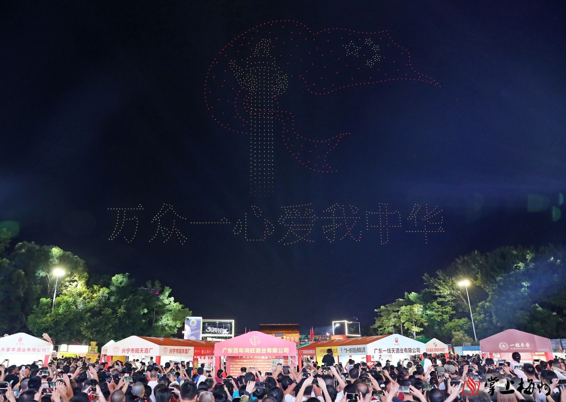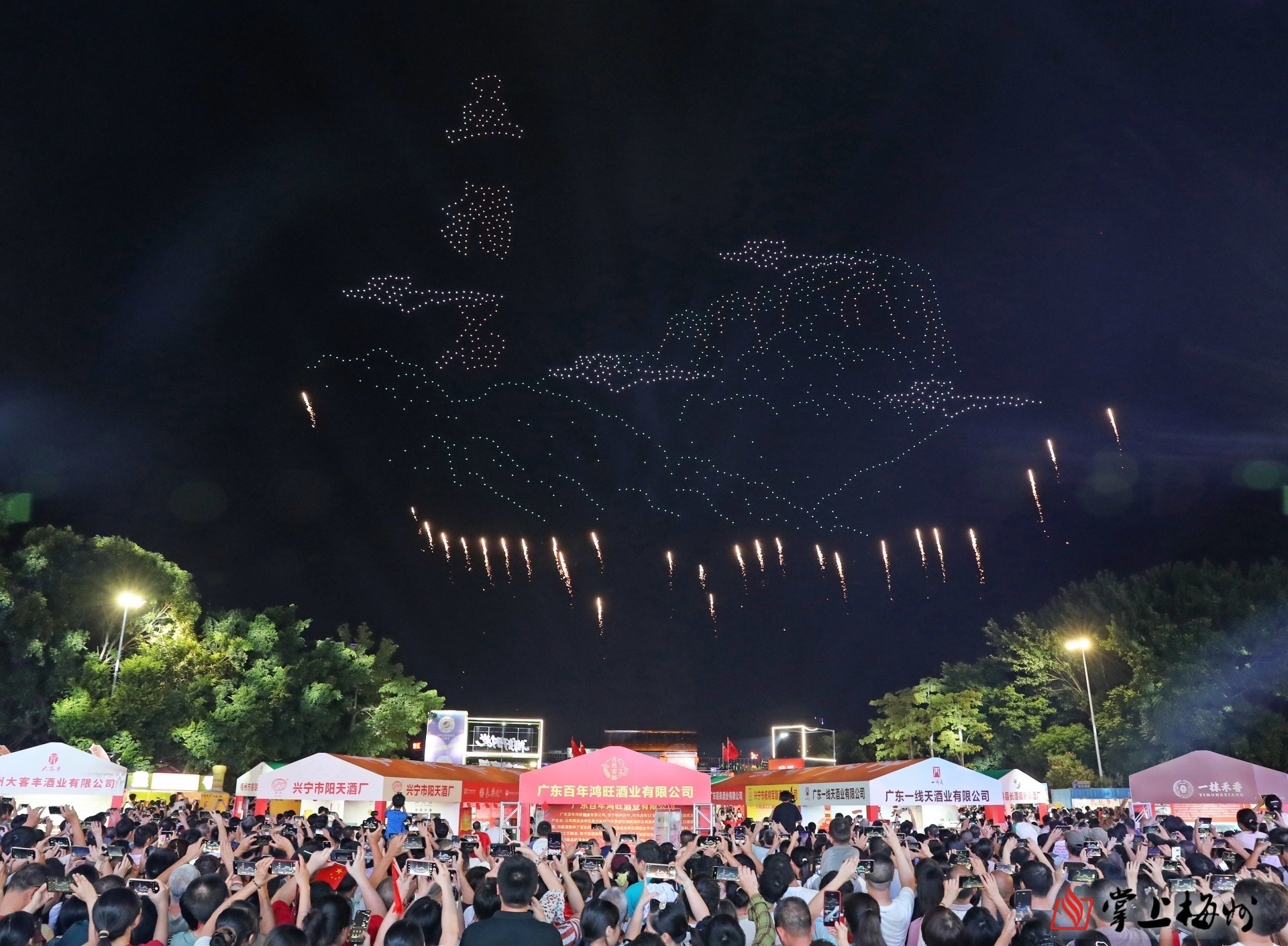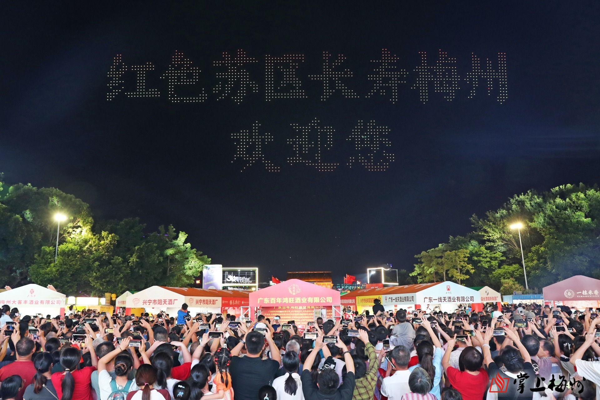 晚上8时20分,近2000架无人机悄然升空,以天为幕,绘就璀璨画卷。“五星红旗”“万众一心爱我中华”“红色苏区长寿梅州欢迎您”“客来是家人”等图形、字样在夜空中依次呈现,“中国米香白酒之都”“五指石”等具有代表性的图案轮番登场,以现代科技之光,展现这座城市深厚的文化底蕴和蓬勃的现代气息。