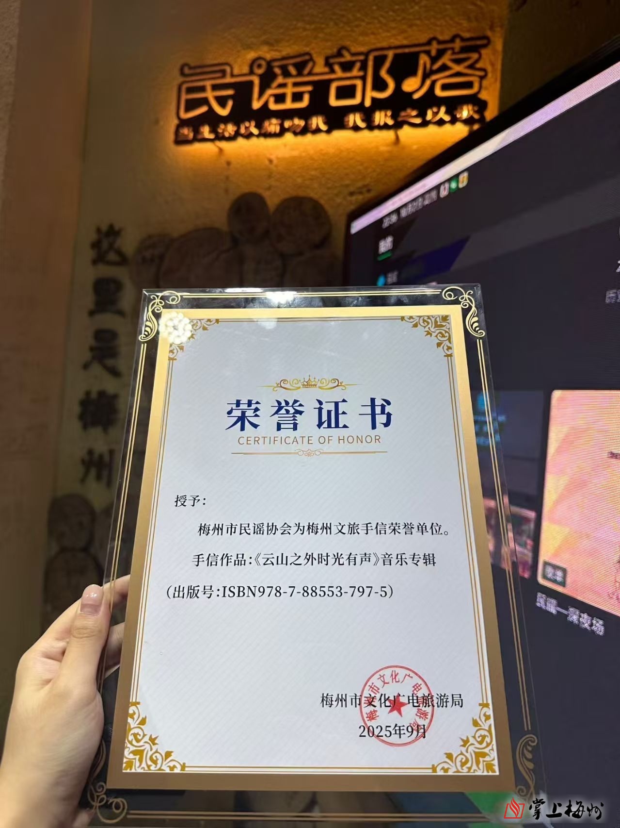 10月2日晚,在“梅”好时光 醉美客都——2025年梅州米香酒文化周系列活动之民谣有约文艺晚会在主会场梅江区院士广场举行。当晚,梅州市民谣协会正式发布《云山之外·时光有声》音乐专辑,该专辑被列为梅州文旅手信作品,梅州市民谣协会被授予“梅州文旅手信荣誉单位”。