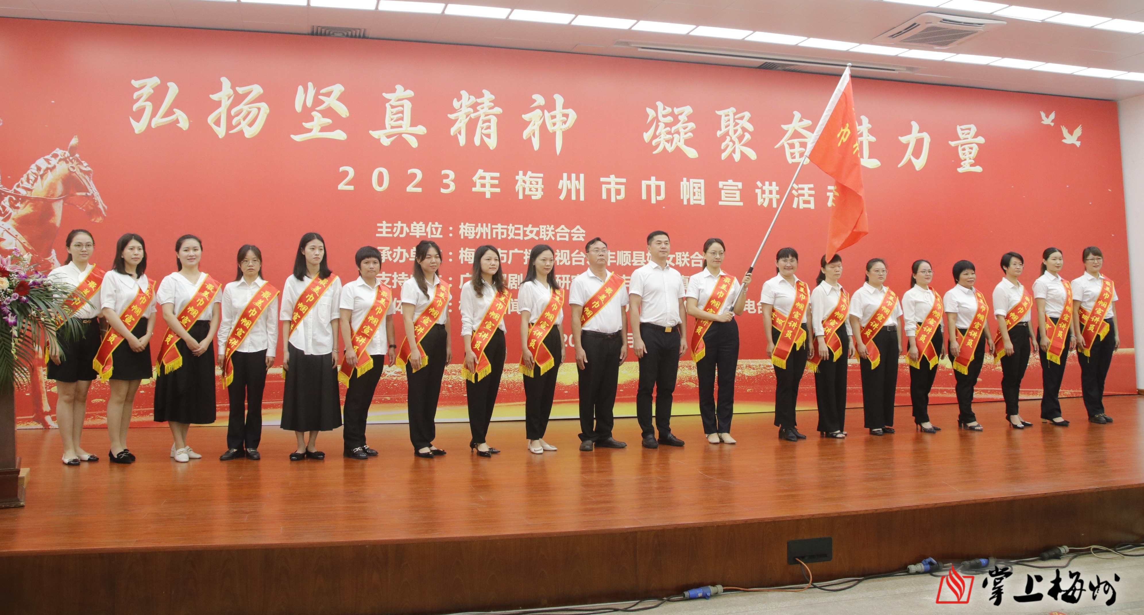 在2023年梅州市巾帼宣讲活动中,为丰顺县坚真纪念馆巾帼宣讲队授旗。