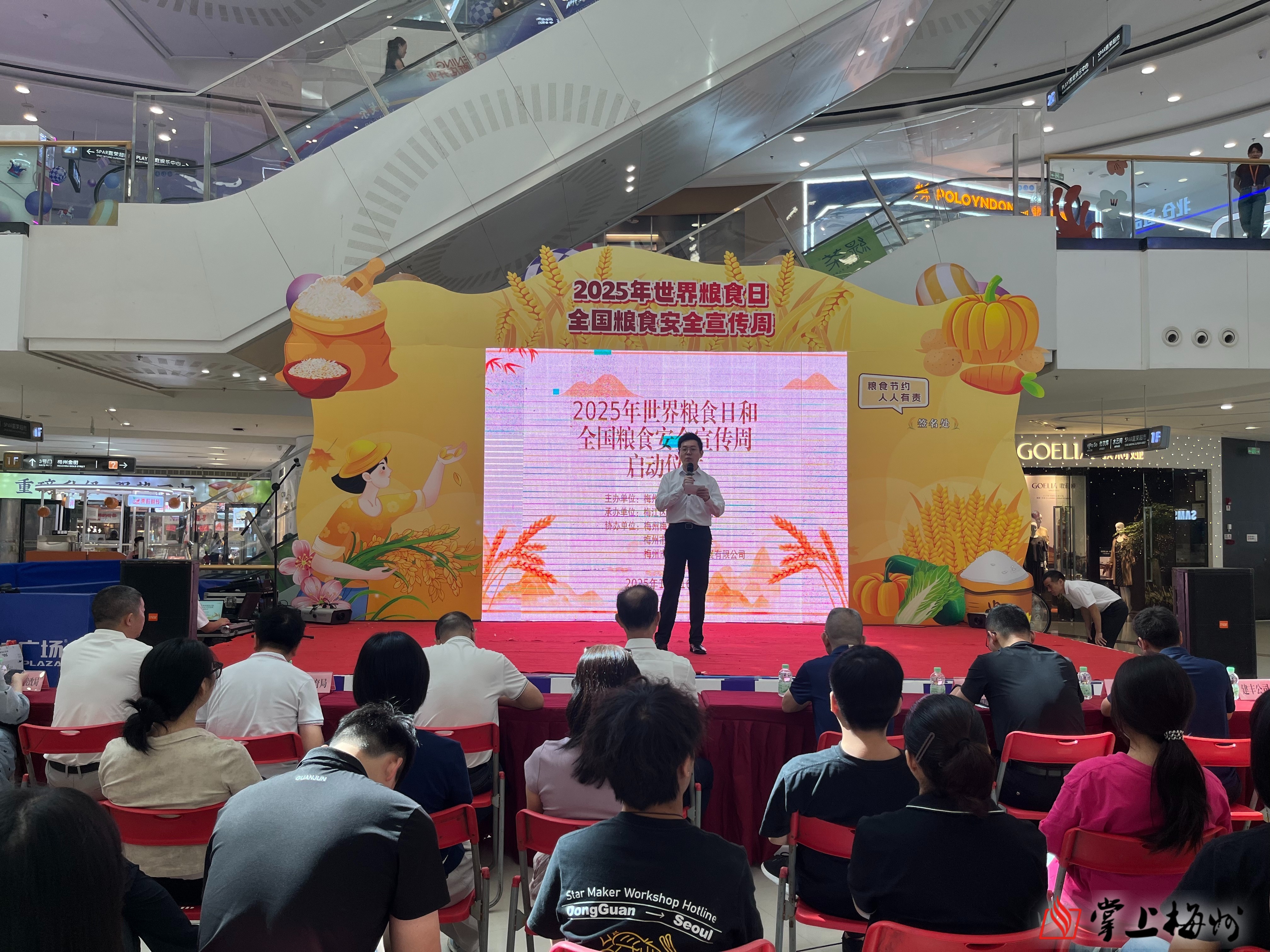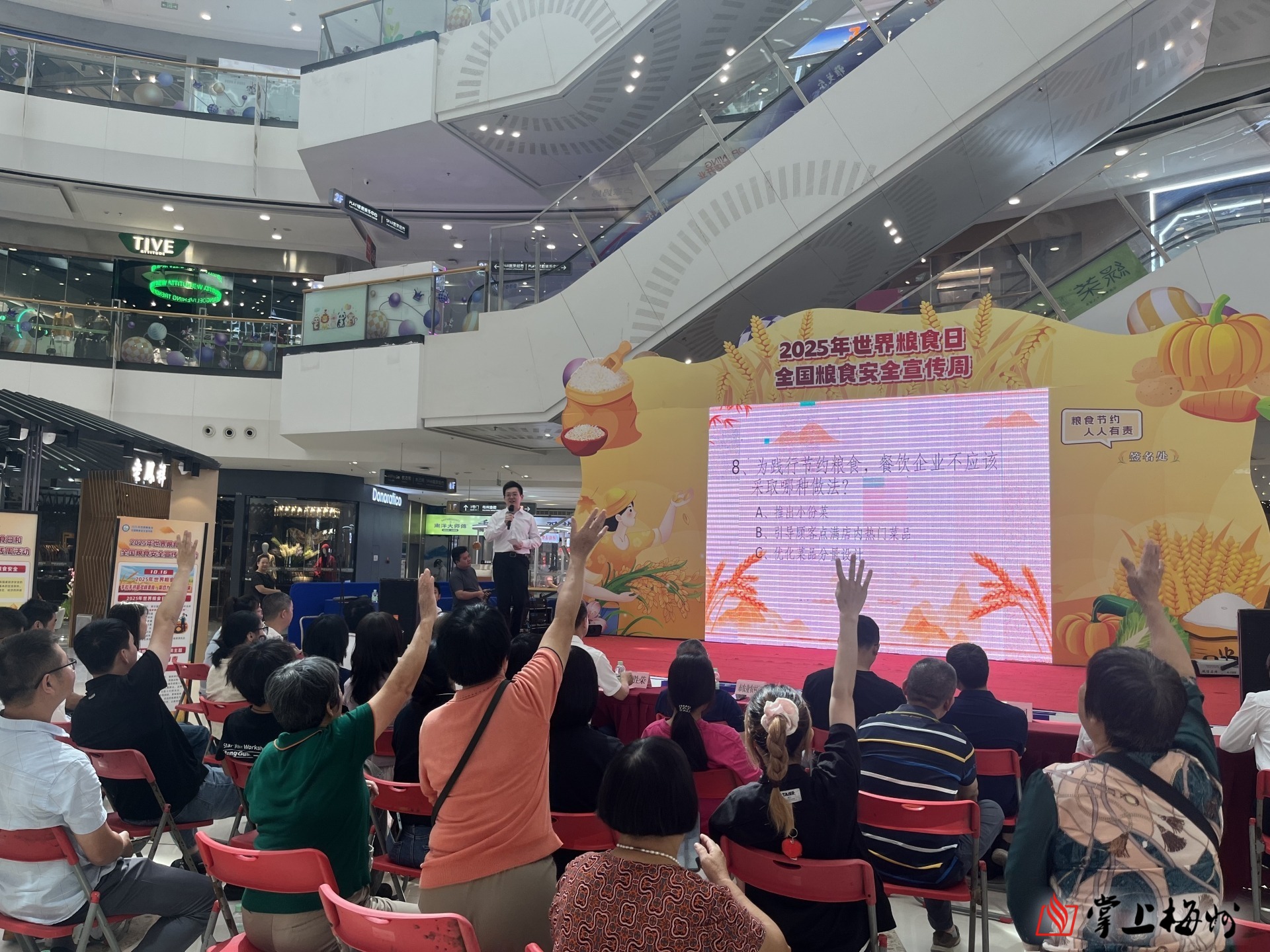 掌上梅州讯 10月16日上午,2025年世界粮食日和全国粮食安全宣传周活动启动仪式在万达广场一楼举办。市发展改革局、市农业农村局、市教育局、团市委、梅江区发展改革局等有关负责同志,以及粮食企业、餐饮商户、市民代表共同参与。