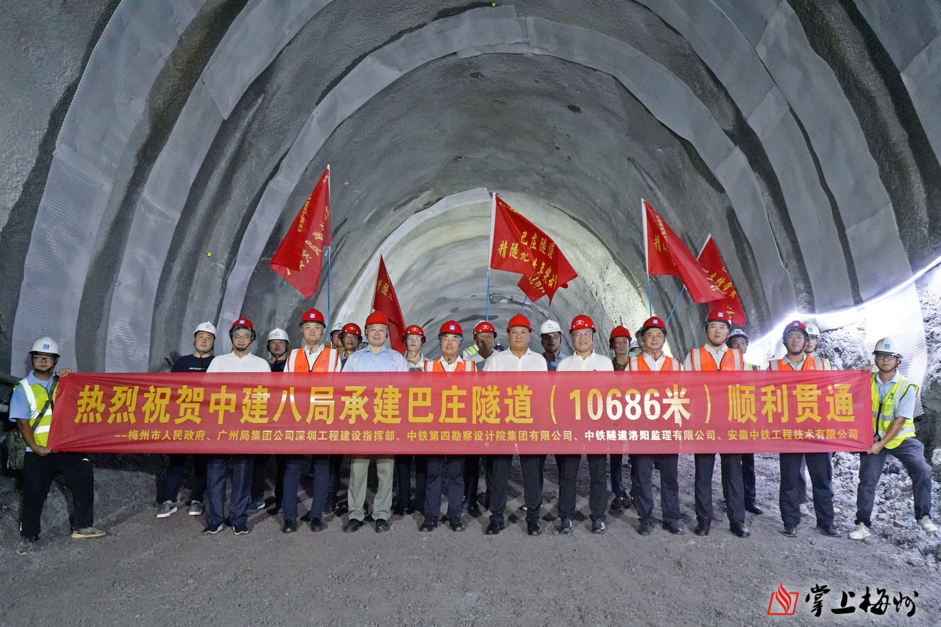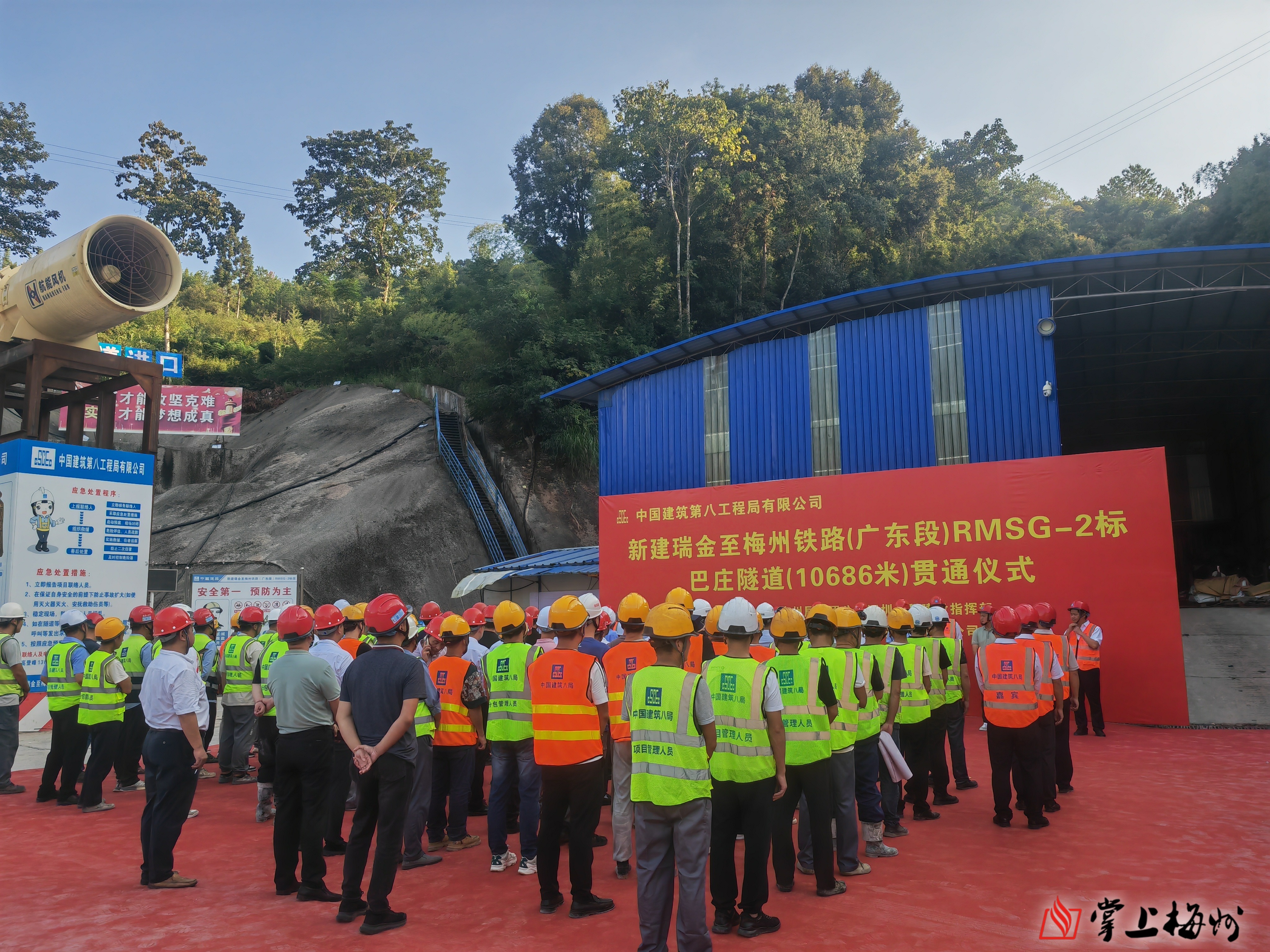 掌上梅州讯 10月16日,随着最后一方岩石被精准破除,由广州局集团深圳建设指挥部负责建设管理,中建八局承建的新建瑞金至梅州铁路(广东段)巴庄隧道顺利贯通,为瑞梅铁路项目高质量建设按下“快进键”。副市长代伟到场见证。