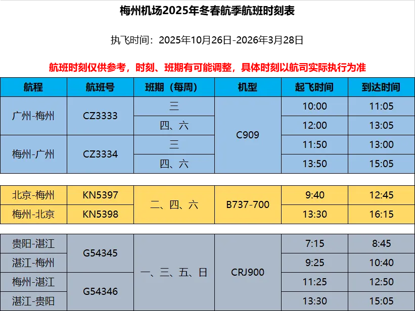 2025年10月26日起,民航冬春航班换季。换季后,梅州机场计划执行北京=梅州、广州=梅州、贵阳=湛江=梅州共3条航线,通航城市4个。