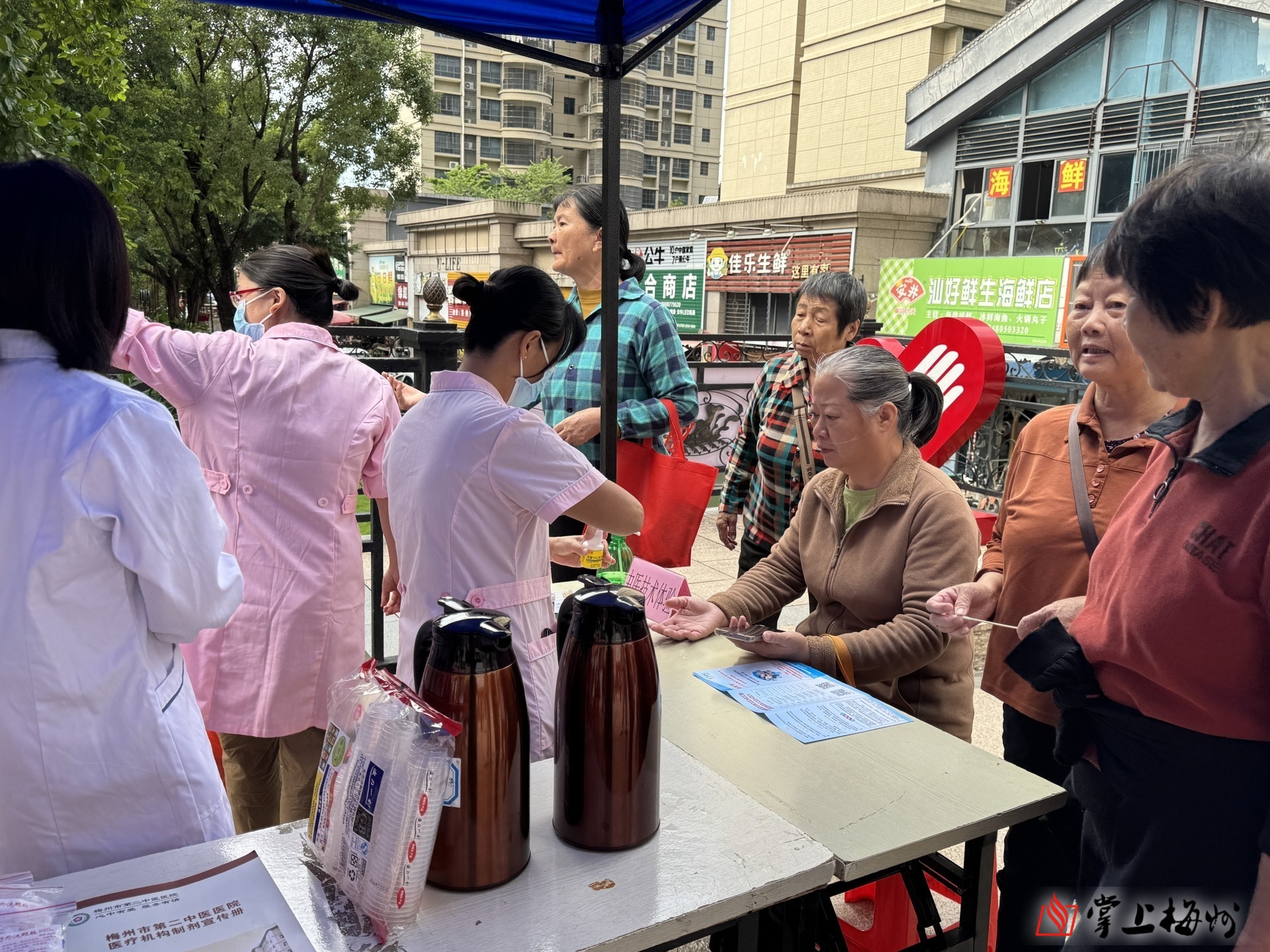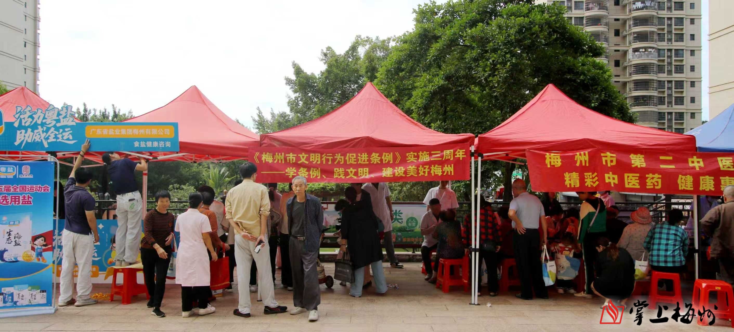 活动现场设置了多个摊位。市、区文明办安排工作人员为市民们提供咨询服务,发放文明宣传手册;梅州市第二中医医院的医疗团队,为群众提供基础健康检查、疾病咨询、用药指导等服务,并发放健康科普资料;广东省盐业集团梅州有限公司为群众提供食盐健康咨询。活动现场众多群众排队咨询,热闹非常。