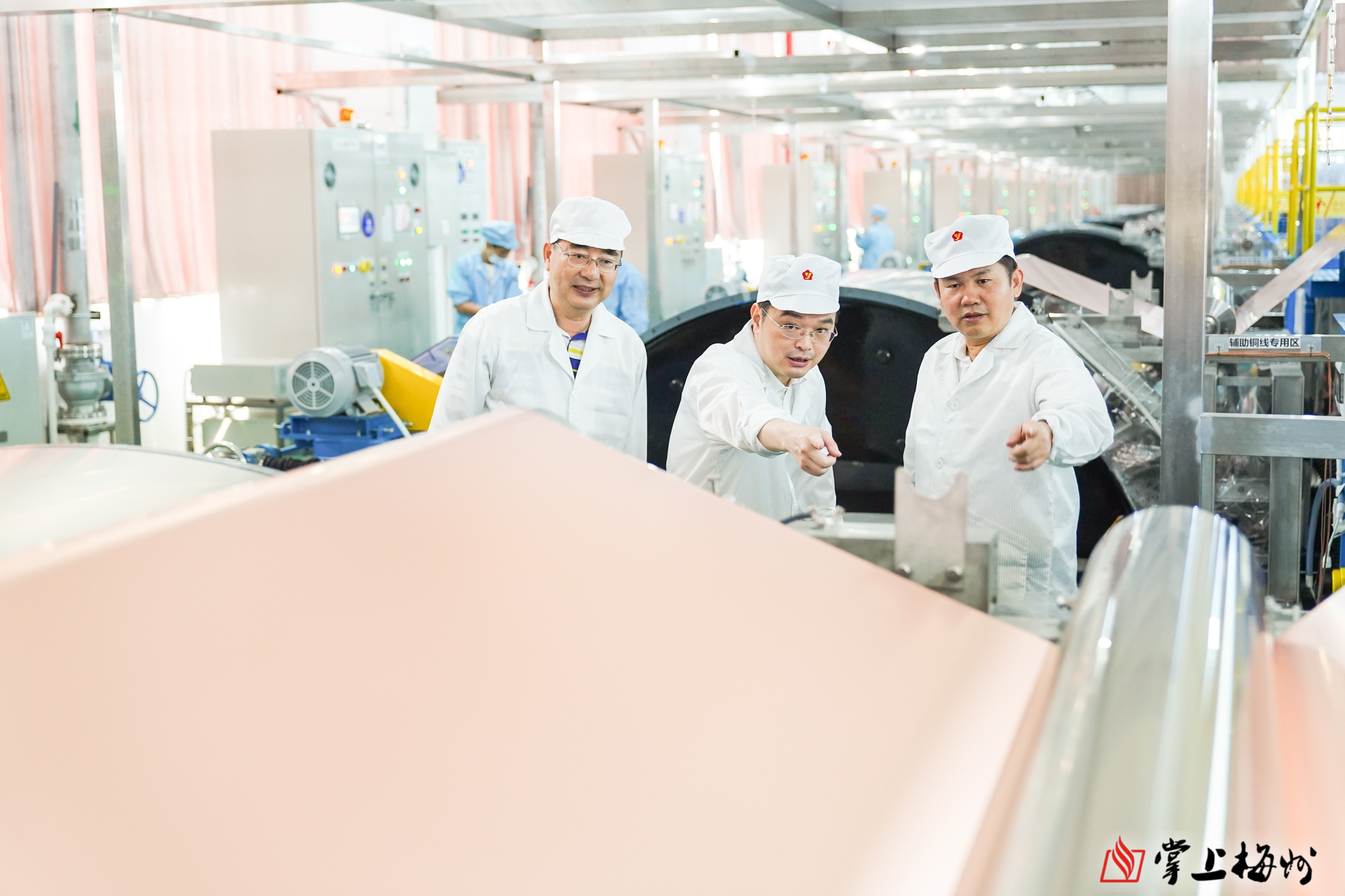 廖平元(中)向广东省政府质量奖评审专家介绍铜箔生产情况。(广东嘉元科技股份有限公司供图)