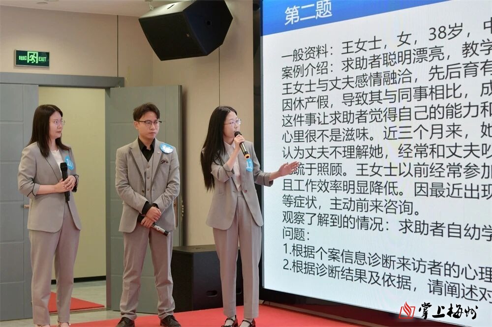 其中,“职工心理健康服务案例分析”环节成为赛事的一大焦点。该环节要求每支队伍的3名选手共同进行陈述,在3分钟内完成案例剖析与方案设计。比赛过程中,各参赛队伍配合默契,分析过程从情绪疏导、问题溯源,到目标确立、方案制定,层层递进,精准抓住案例的核心诉求,充分展现出扎实的专业素养与高效的团队协作能力,赢得了现场观众的阵阵掌声。