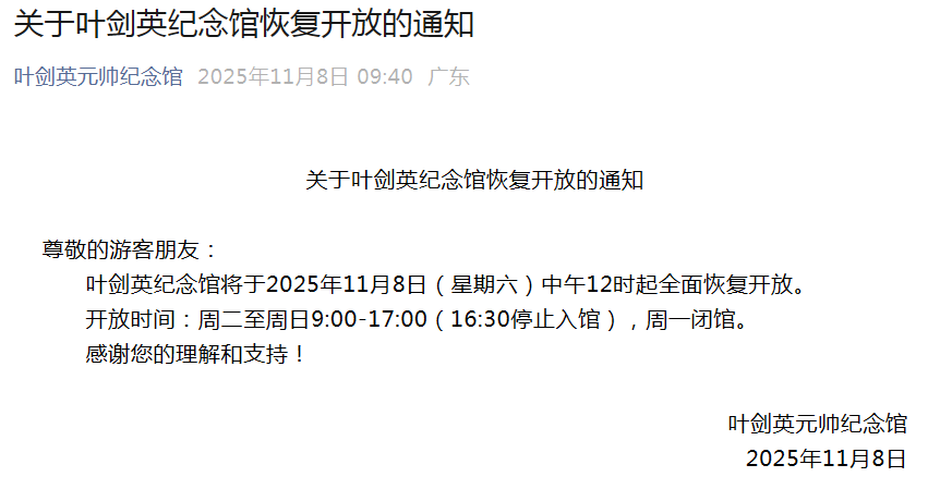 今日12时起,叶剑英纪念馆全面恢复开放 2025-11-08 10:20 叶剑英元帅纪念馆 8 掌上梅州讯 小编从“叶剑英元帅纪念馆”微信公众号获悉,该馆将于今日中午12时起全面恢复开放。具体时间安排如下: 编辑:杨舒琳 审核:蔡颜颜
