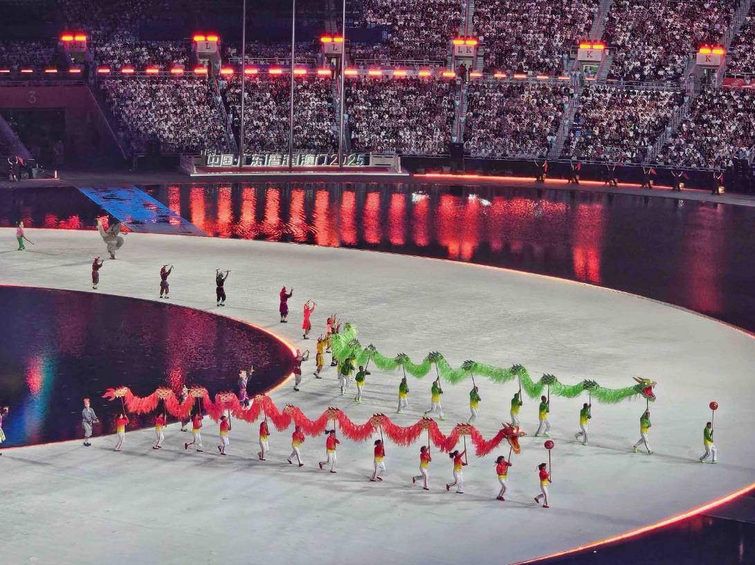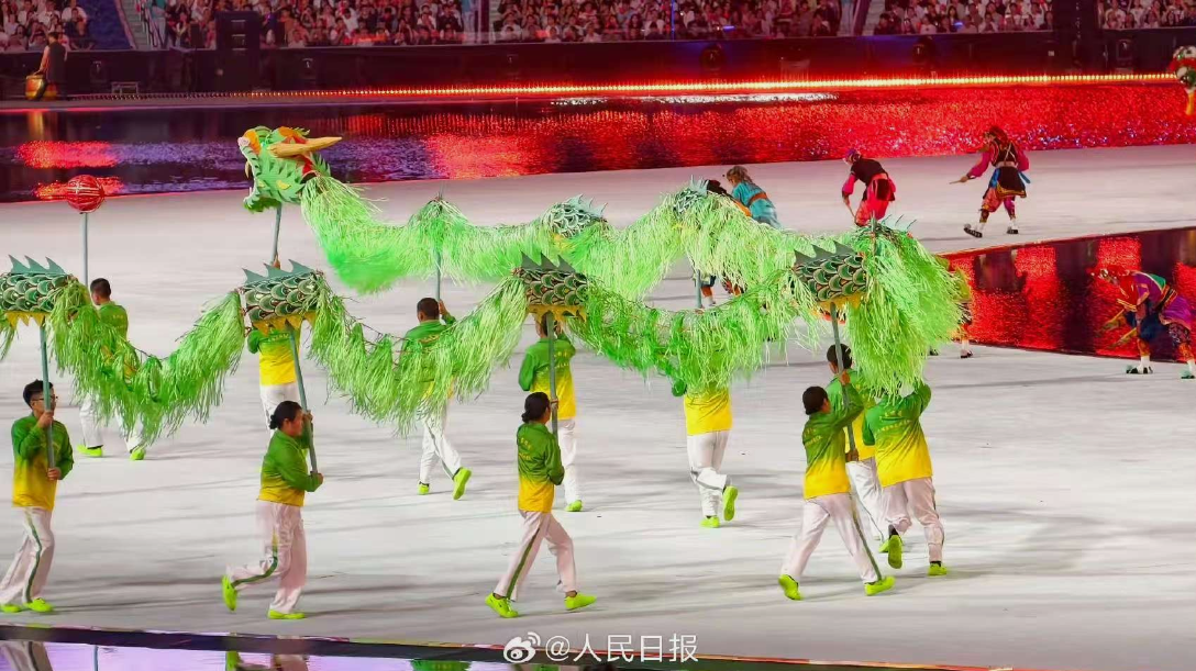 “这次节目表演相对有难度。”梅州市大埔茶阳花环龙表演队队长兼龙头手余惠娇告诉记者,今年6月份,开幕式导演组曾到大埔茶阳考察选拔表演节目,9月确定了表演任务后便组织人员积极备战。因平时舞龙表演是搭配传统锣鼓乐,这次搭配歌曲进行表演,所以节奏、动作各方面一直在调整,大家都非常专注,一起努力呈现最佳舞台效果。演出当晚,号角破空响起,鼓槌骤雨倾泻,梅州“花环龙”自舞台两侧腾跃而出,于环形舞台交相盘桓。龙躯绵延数十米,龙须劲舞,龙目如电,流光溢彩,既保留传统韵味,又融入现代舞台美学,赢得现场观众热烈掌声。