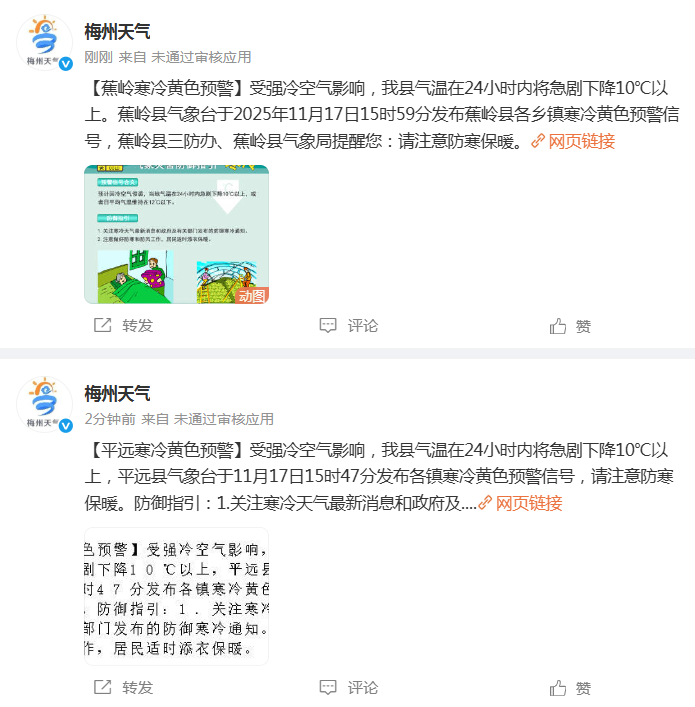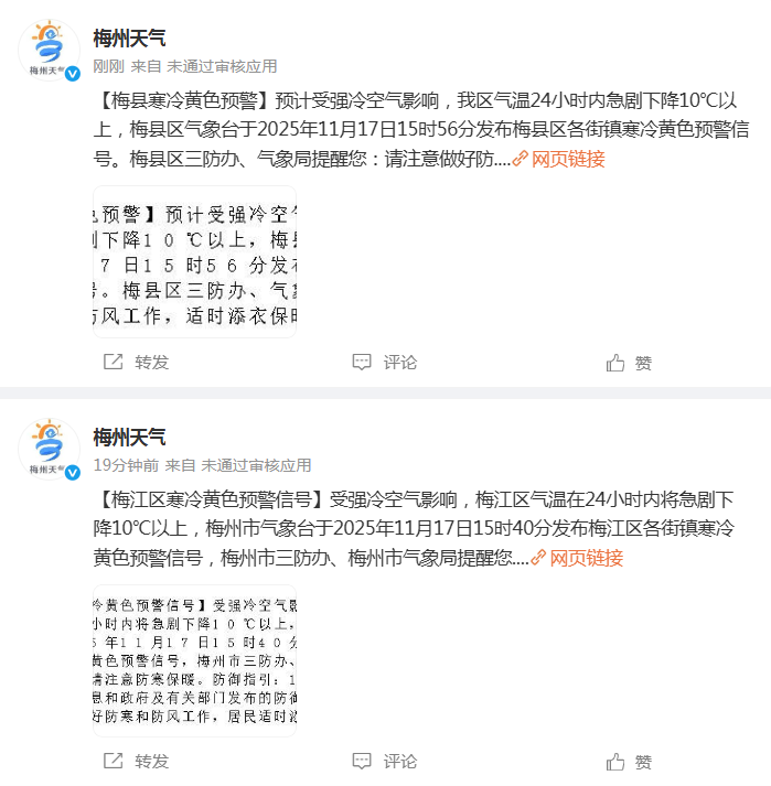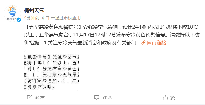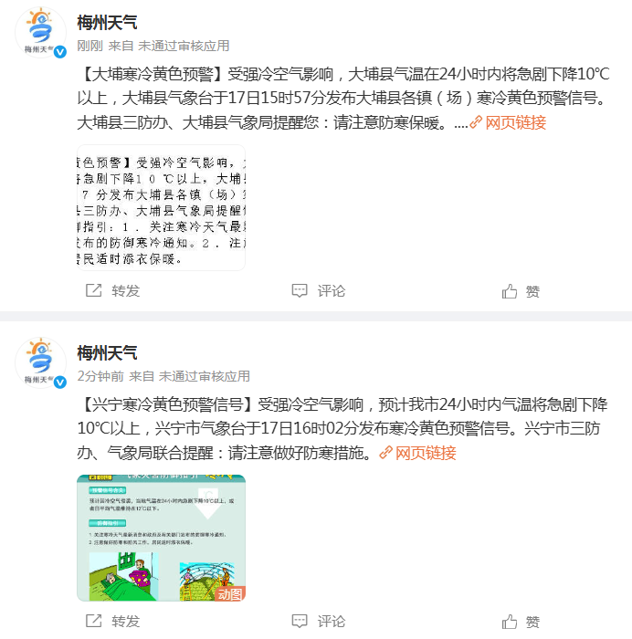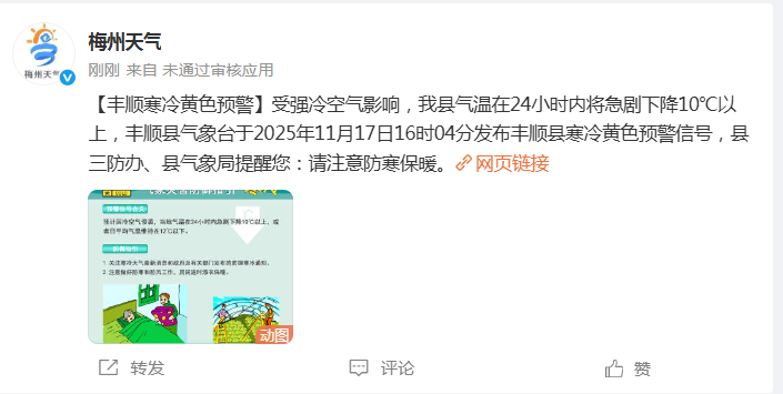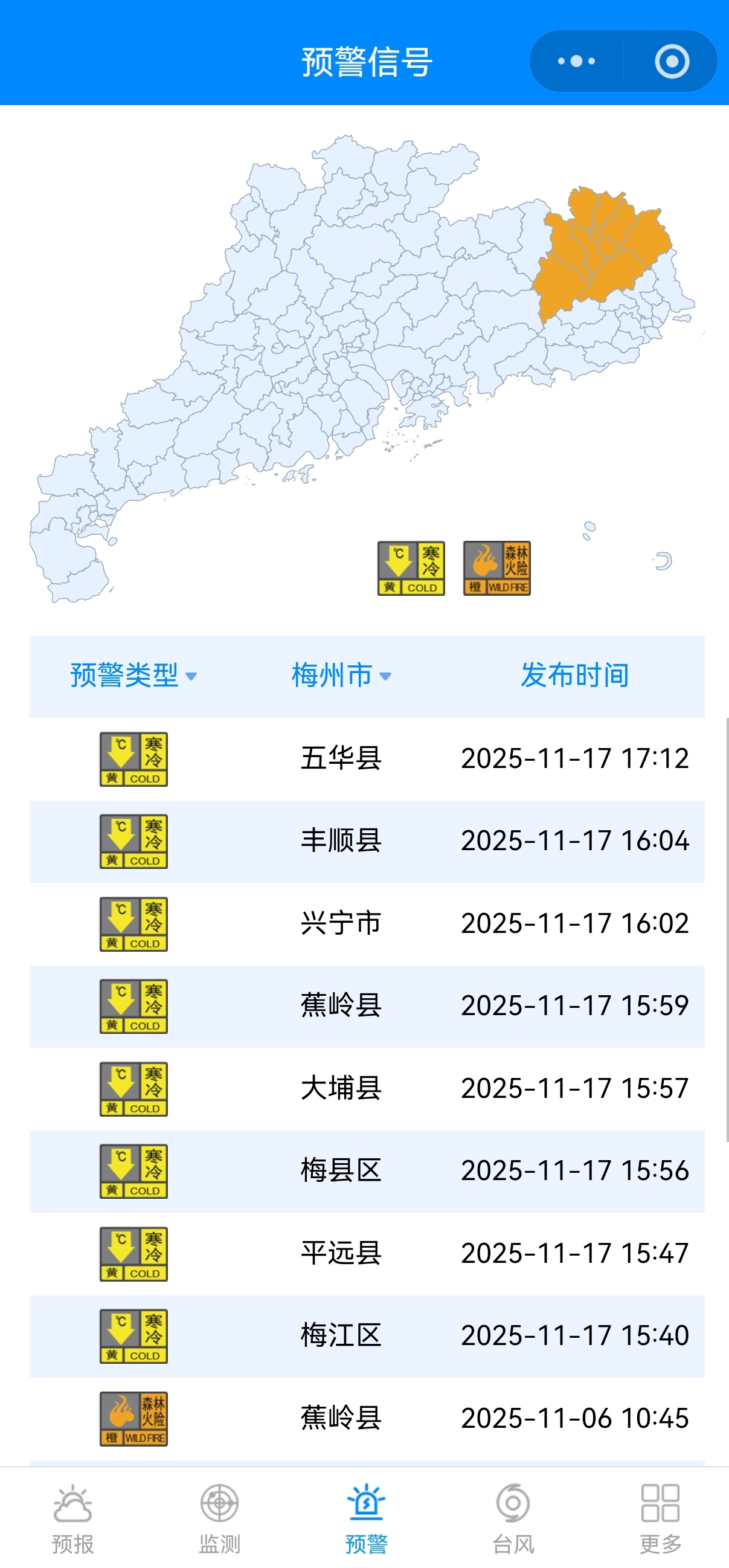 掌上梅州讯 记者从市气象局获悉,今天夜间起受强冷空气影响,我市气温骤降。预计气温24小时内急剧下降10℃以上,梅江区、平远县、梅县区、大埔县、蕉岭县、兴宁市、丰顺县、五华县于今天下午先后发布寒冷黄色预警信号。