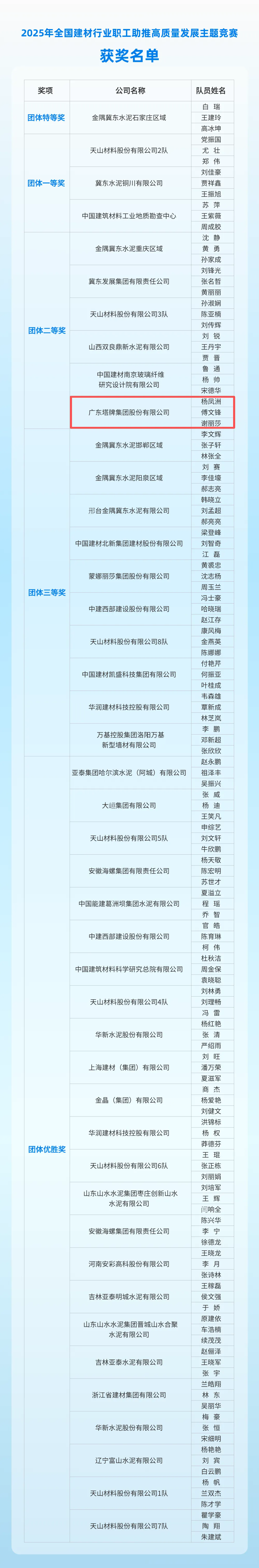 近日,2025年全国建材行业职工助推高质量发展主题竞赛决赛举行。广东塔牌集团股份有限公司三名技术骨干杨凤洲、傅文锋、谢丽莎组成的代表队,凭借扎实的专业功底、出色的团队协作与全面的综合能力,荣获团体二等奖。