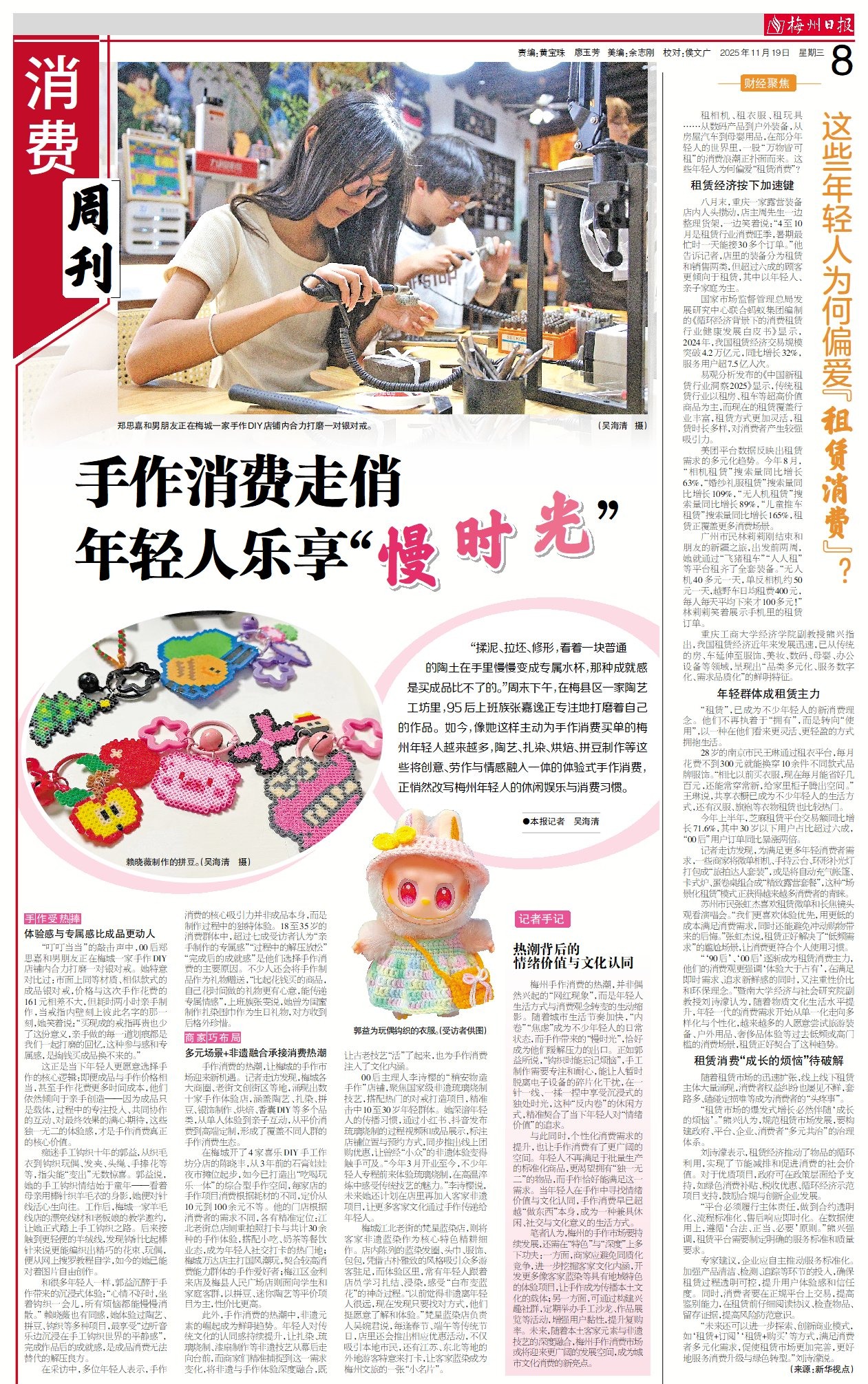 “揉泥、拉坯、修形,看着一块普通的陶土在手里慢慢变成专属水杯,那种成就感是买成品比不了的。”周末下午,在梅县区一家陶艺工坊里,95后上班族张嘉逸正专注地打磨着自己的作品。如今,像她这样主动为手作消费买单的梅州年轻人越来越多,陶艺、扎染、烘焙、拼豆制作等这些将创意、劳作与情感融入一体的体验式手作消费,正悄然改写梅州年轻人的休闲娱乐与消费习惯。