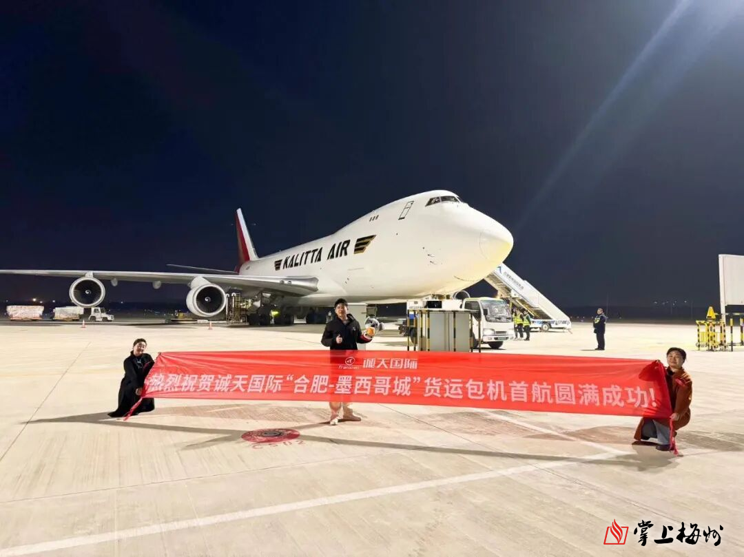 冯凌炬(中)与团队庆祝诚天国际“合肥-墨西哥城”跨境包机首航成功。