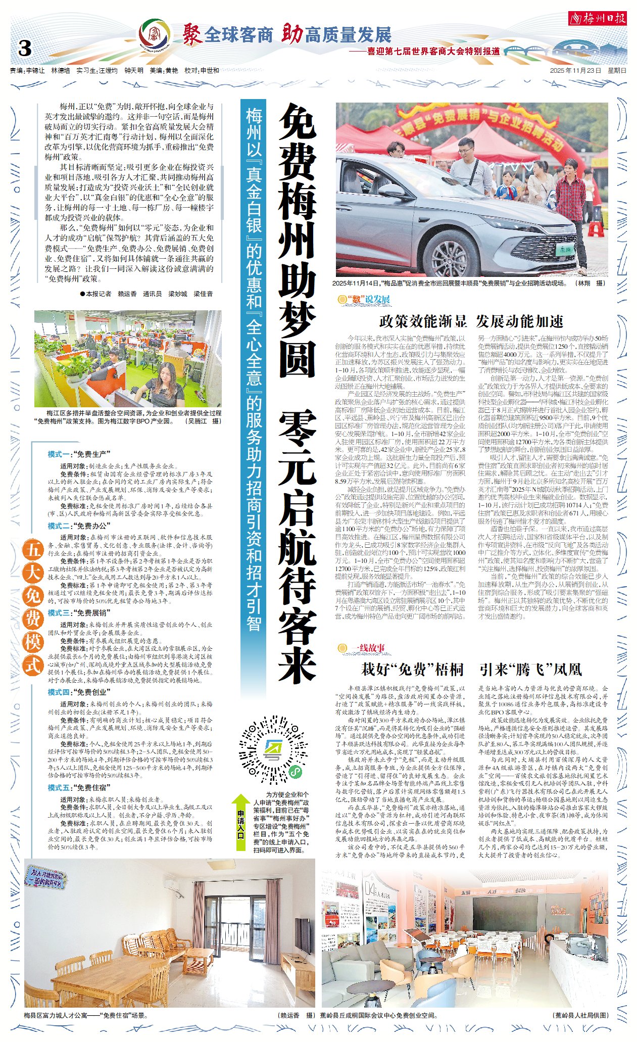 当前,“免费梅州”政策的综合效能已步入加速释放期,从生产到办公,从展销到创业,从住宿到综合服务,形成了吸引要素集聚的“强磁场”。梅州正以其独特的政策优势、不断优化的营商环境和巨大的发展潜力,向全球客商和英才发出盛情邀约。