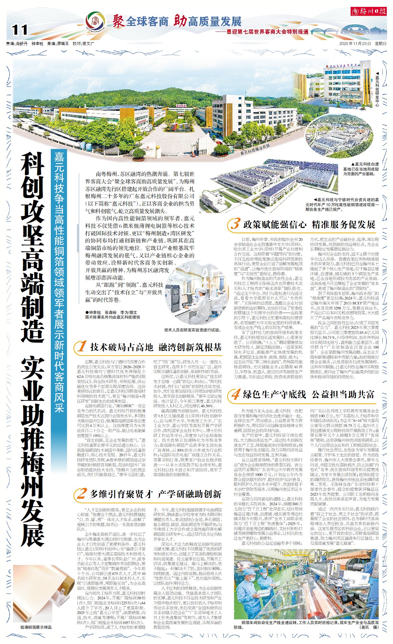 南粤梅州,苏区融湾的热潮奔涌。第七届世界客商大会“聚全球客商助高质量发展”,为梅州苏区融湾先行区搭建起开放合作的广阔平台。扎根梅州二十多年的广东嘉元科技股份有限公司(以下简称“嘉元科技”),正以客商企业的担当勇气和科创底气,屹立高质量发展潮头。