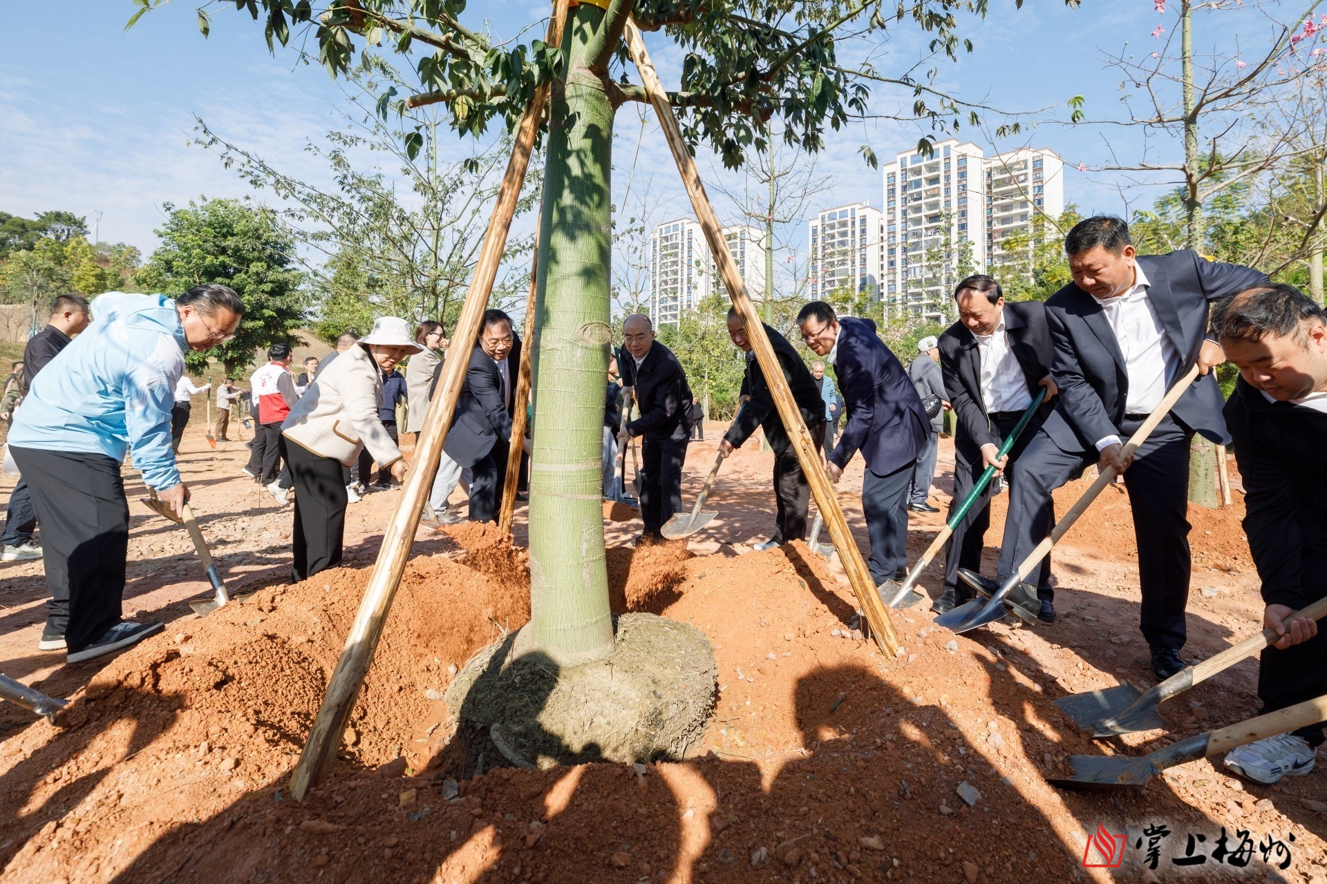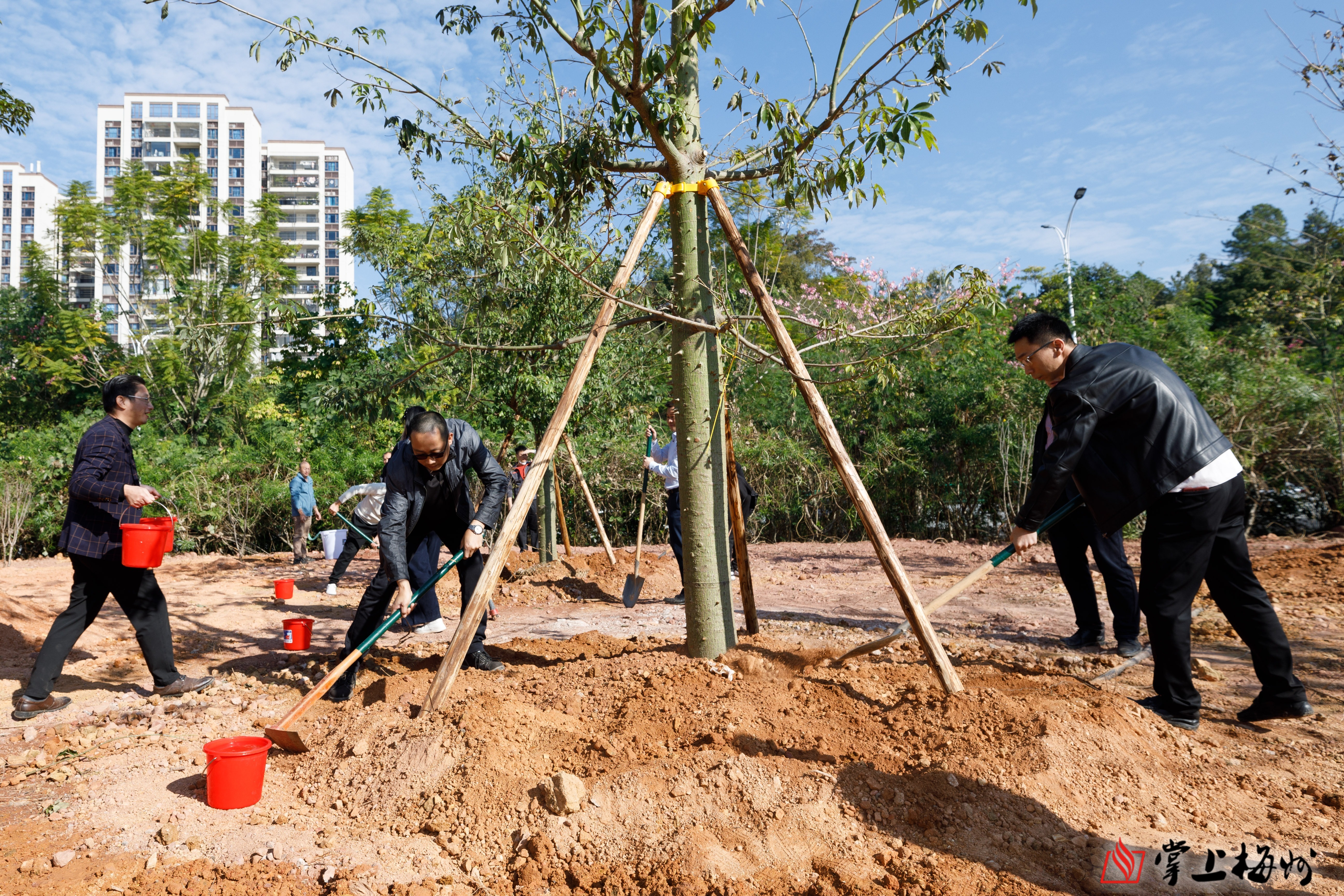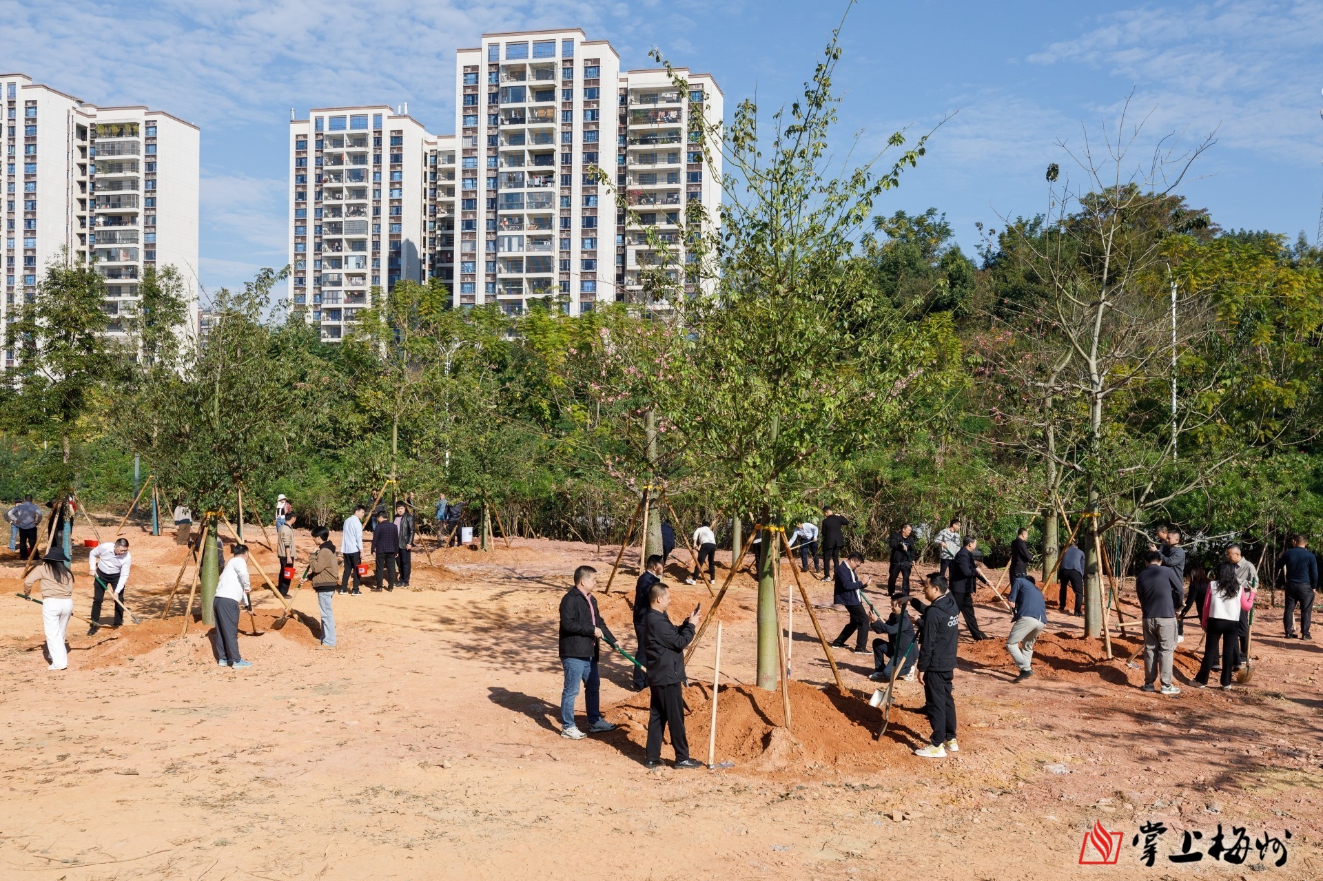 活动现场暖意融融、干劲满满。大家自发组成若干小组,默契配合、分工协作,合力扶稳树苗,仔细调整栽种角度,保证树干笔直;一起挥锹铲土,将湿润的土壤层层压实,筑牢苗木生长根基;最后提着水桶穿梭林间,为新栽的树苗浇上“定根水”……每一个动作都饱含了对家乡生态建设的热忱。短短一个上午,36株美丽异木棉、紫花风铃木、楠木等有价值、有时间沉淀价值的珍贵树种顺利栽种完成。新栽苗木与公园现有景观相映成辉,为市民打造了一处景致宜人的生态休闲空间,既有效提升了该区域的绿化覆盖率和生态景观品质,增强了公园的生态功能,也为改善城市生态环境注入了新活力,成为彰显梅州绿色发展理念的又一亮丽名片。