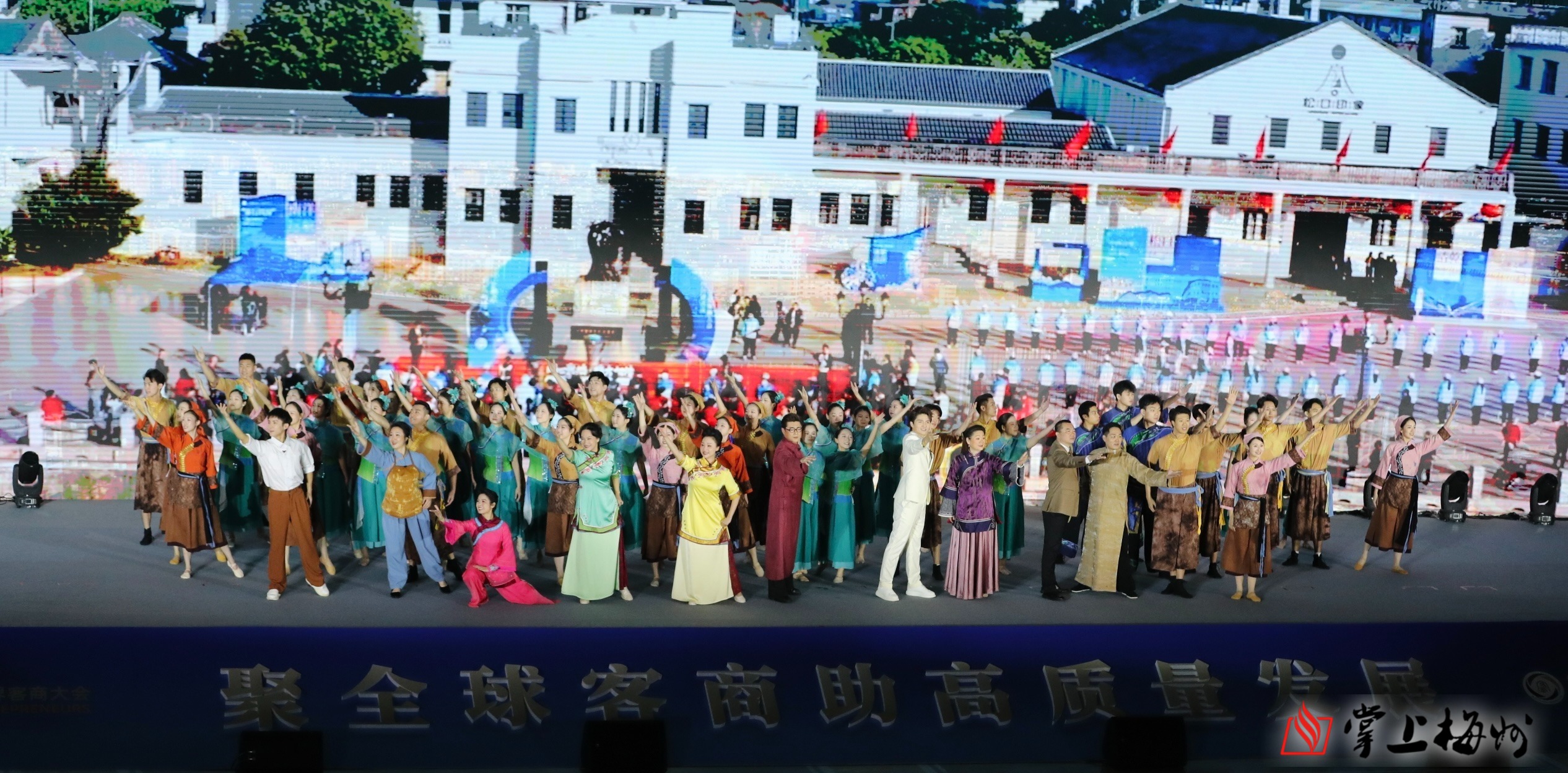 掌上梅州讯 “哦~嘿~”上午10点08分许,山歌号子响起,孩子们跑上舞台,唱响一首客家童谣,拉开了点火仪式的序幕。在非遗展演《同心聚焰•薪火相传》中,一首《阿姆在哪里 家就在哪里》贯穿始终,演员们以深情的演绎展现了客家人离开故乡,外出拼搏的情景。伴随着历代客家名人故事的展现,国家级非物质文化遗产广东汉剧、梅州客家山歌依次唱响,为参会者带来一场视觉震撼。