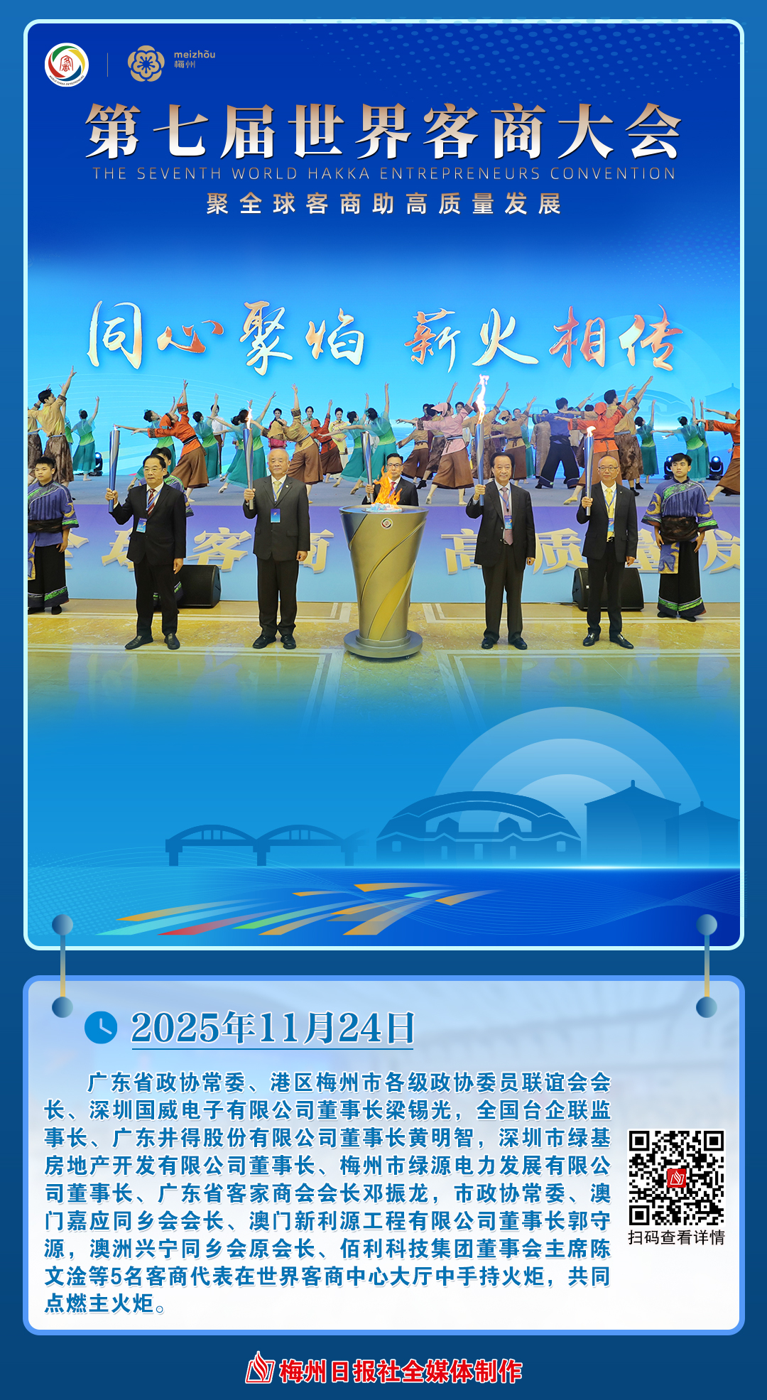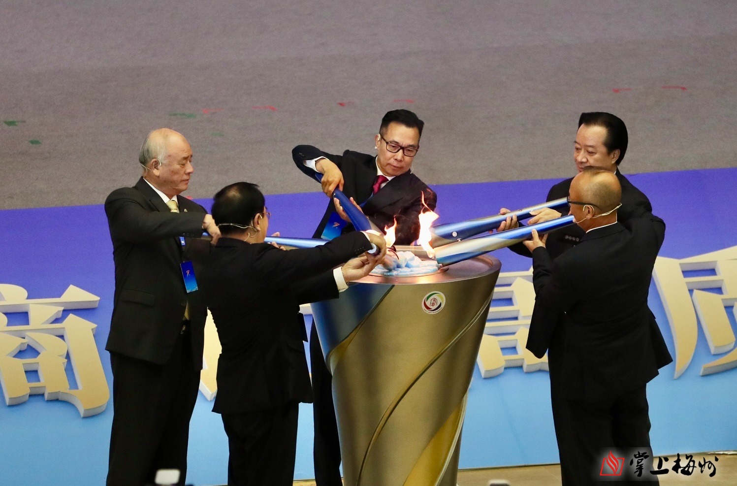 10点20分许,广东省政协常委、港区梅州市各级政协委员联谊会会长、深圳国威电子有限公司董事长梁锡光,全国台企联监事长、广东井得股份有限公司董事长黄明智,深圳市绿基房地产开发有限公司董事长、梅州市绿源电力发展有限公司董事长、广东省客家商会会长邓振龙,市政协常委、澳门嘉应同乡会会长、澳门新利源工程有限公司董事长郭守源,澳洲兴宁同乡会原会长、佰利科技集团董事会主席陈文淦等5名客商代表在世界客商中心大厅中手持火炬,共同点燃主火炬。