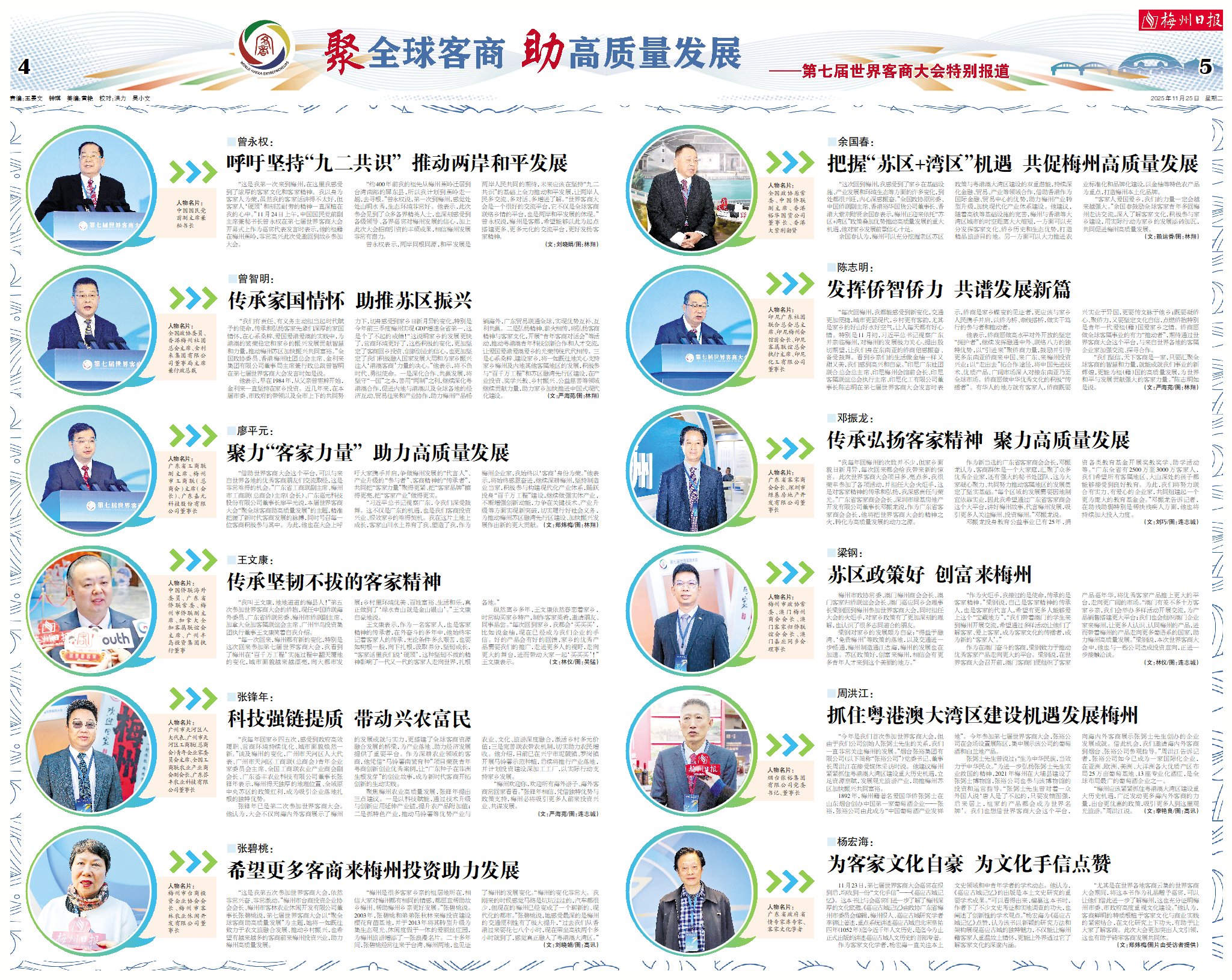 “我们有责任、有义务主动担当起时代赋予的使命,传承和弘扬客家先辈们深厚的家国情怀,在心系桑梓、爱国爱港爱澳的实践中,为港澳的繁荣稳定和家乡的振兴发展贡献智慧和力量,推动梅州苏区加快振兴共同富裕。”全国政协委员、香港梅州社团总会主席、金利来集团有限公司董事局主席兼行政总裁曾智明在第七届世界客商大会发言时如是说。