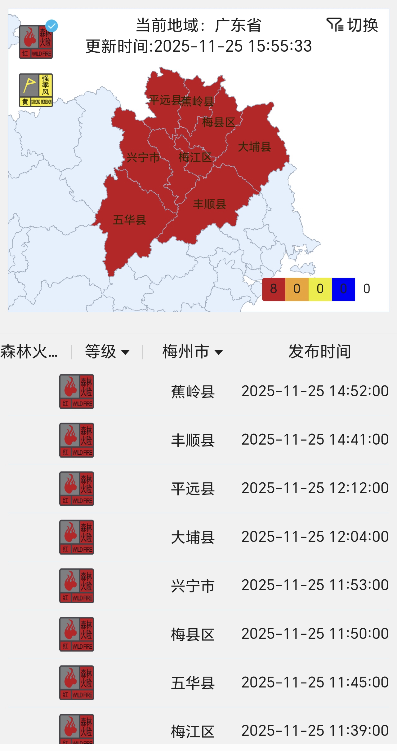 据@梅州天气,预计我市晴朗干燥天气持续,森林火灾极易发生,截至25日下午4时,梅州8个县(市、区)均已发布森林火险红色预警信号。天干物燥,小伙伴们别忘了多喝水补充水分,还要注意用火安全噢~