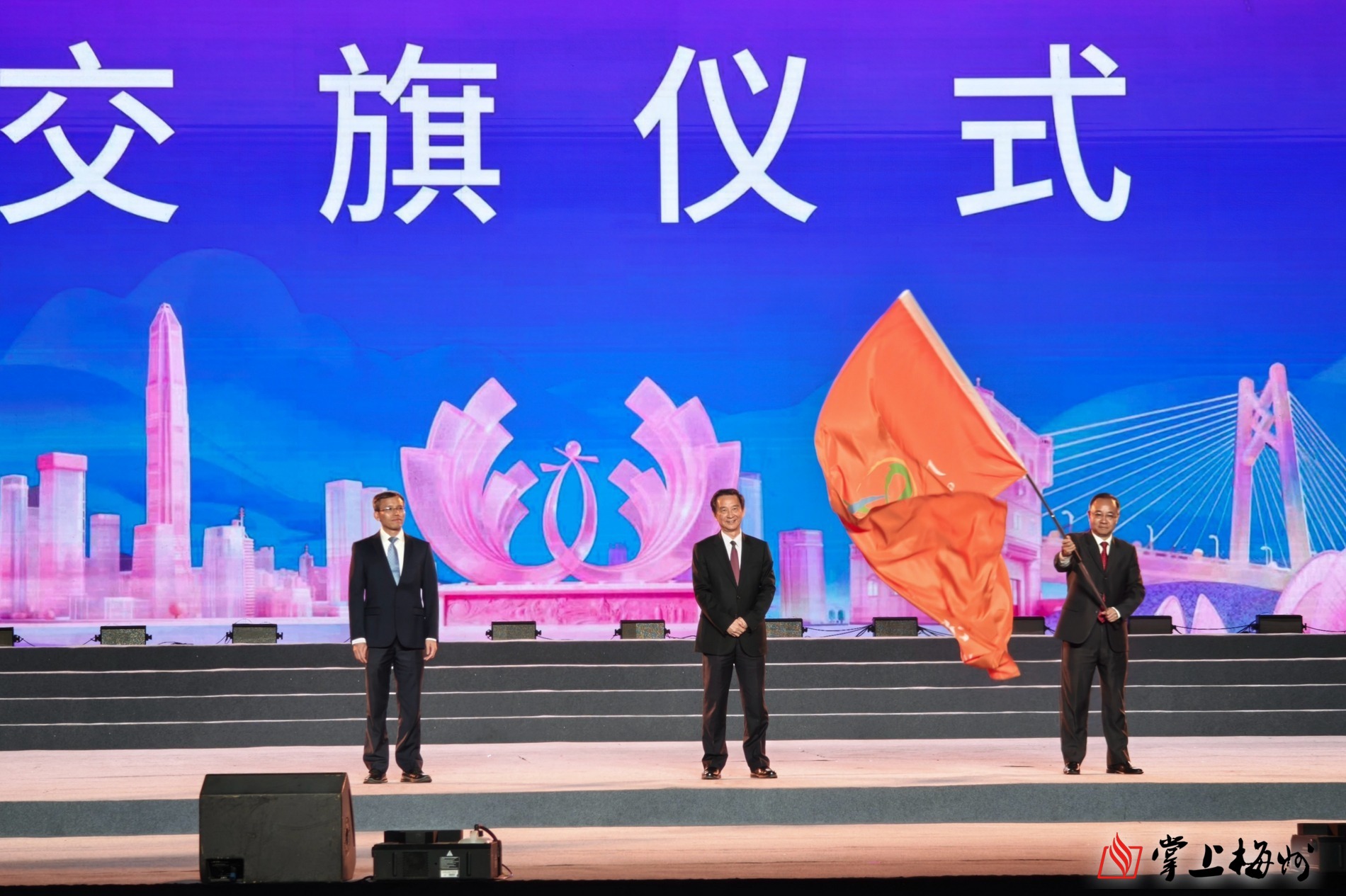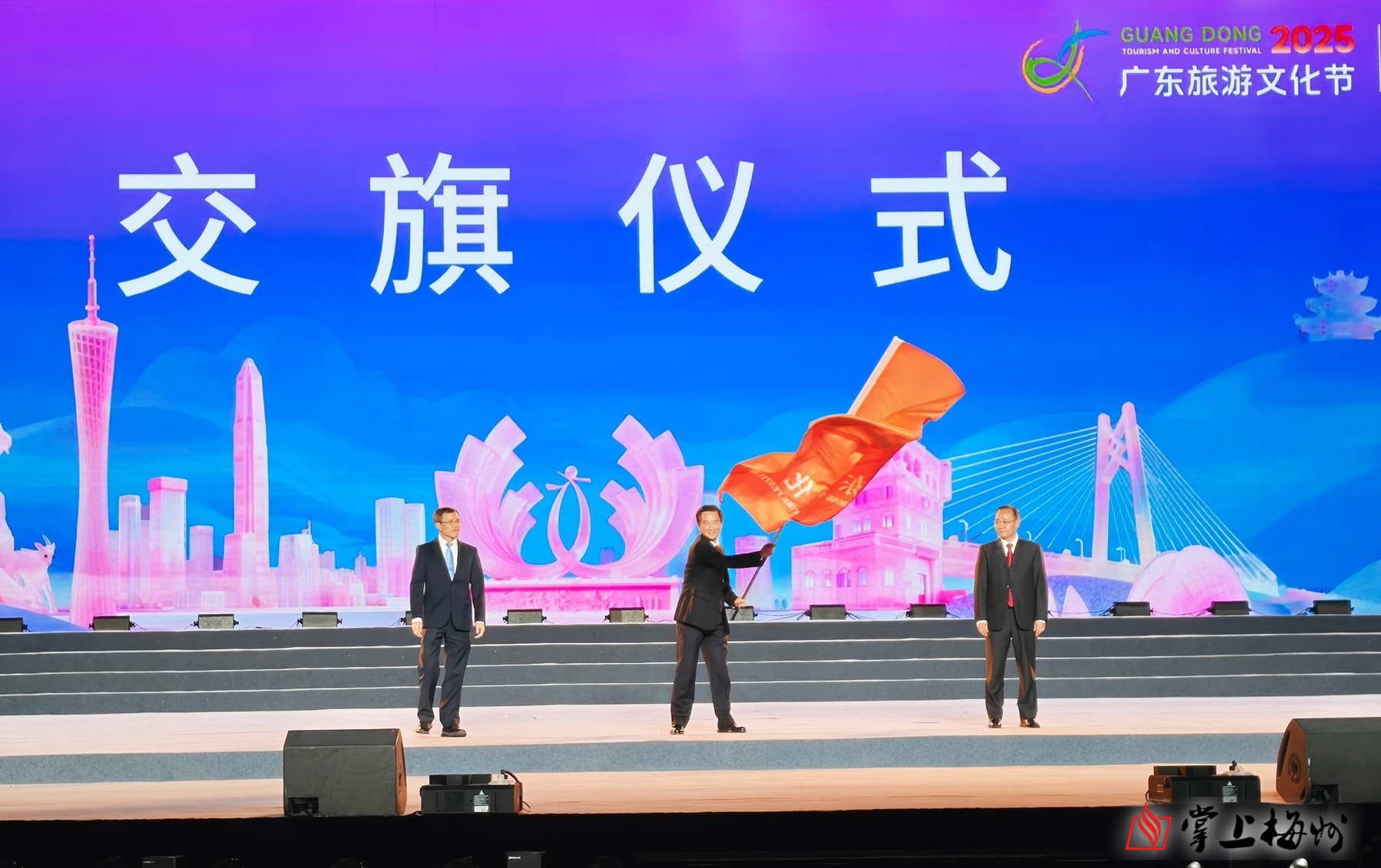 11月28日,在2025年广东旅游文化节开幕式上,广东省人民政府副省长张少康为下一届举办城市梅州市授予会旗,梅州市人民政府副市长谢钦文代表梅州接旗。