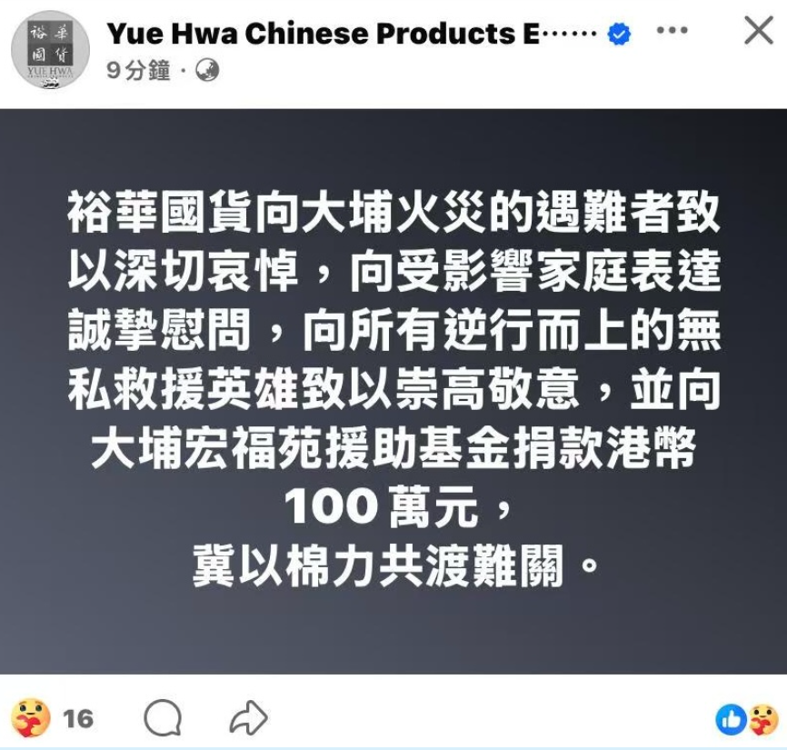 此外,裕华国货也通过社交媒体宣布,向大埔宏福苑援助基金捐款港币100万元,冀以绵力共渡难关。据悉,香港裕华集团主席、裕华国产百货公司董事长兼总经理余国春祖籍梅州,是香港著名的实业家,享有“国货大王”之称。在不久前举行的第七届世界客商大会上,余国春回梅出席活动并担任“同心聚焰·薪火相传”火炬传递活动的1号火炬手。