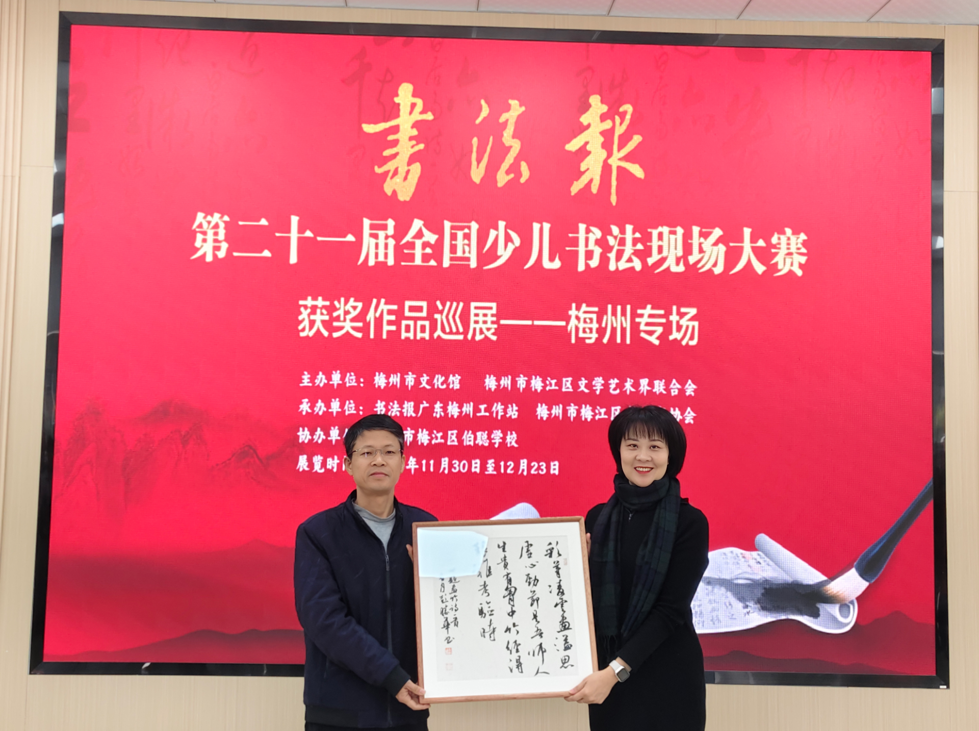 11月30日,“书法报第二十一届全国少儿书法现场大赛获奖作品巡展——梅州专场”在梅州市文化馆正式开幕。此次巡展由梅州市文化馆、梅州市梅江区文学艺术届联合会主办,书法报广东梅州工作站、梅州市梅江区书法家协会承办,梅州市梅江区伯聪学校协办。开幕仪式吸引了主办、承办及协办单位相关领导嘉宾,梅江区伯聪学校师生代表和众多书画爱好者100多人到场参与,共同见证这场少儿书法艺术盛宴。