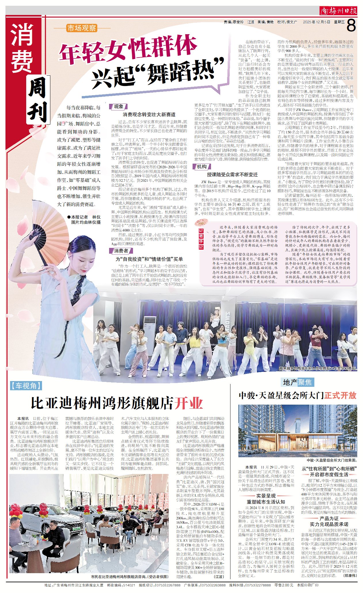 每当夜幕降临,每当假期来临,梅城的公园、广场、舞蹈房中,总能看到舞动的身影。或为了减肥、塑形等健康需求,或为了满足社交需求,近年来学习舞蹈的年轻女性逐渐增加,从而梅州的舞蹈工作室,如“零基础”成人爵士、中国舞舞蹈房等也不断增加,催生并壮大了新的消费赛道。