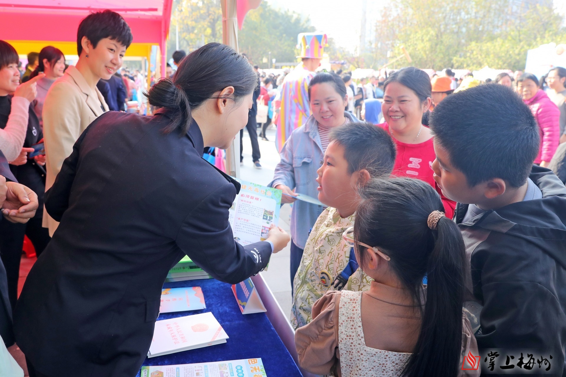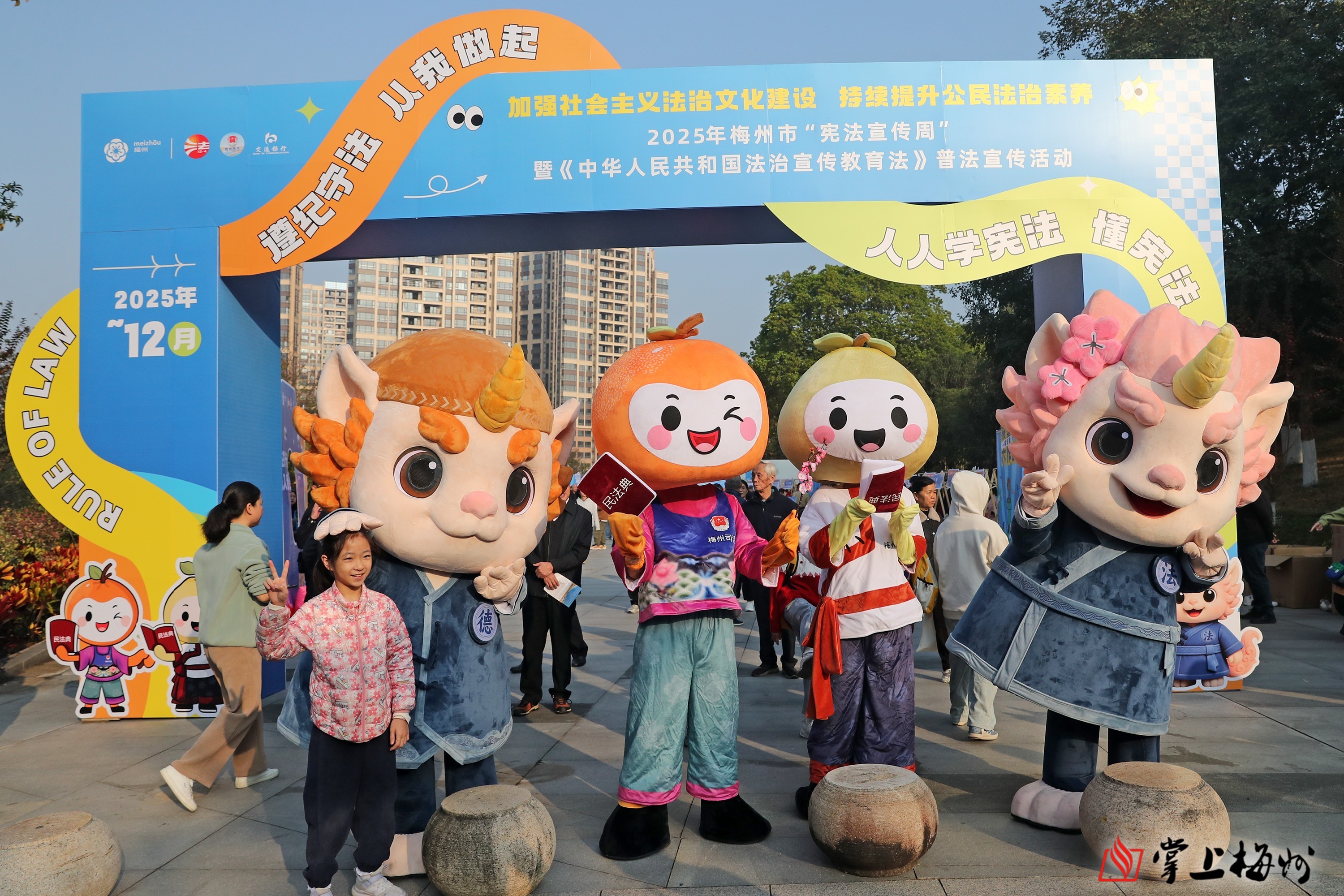 本次活动由梅州市司法局联合梅江区人大常委会办公室、梅江区司法局、交通银行股份有限公司梅州分行等单位主办,现场设置50多个法治宣传展位,工作人员面对面向群众宣传《中华人民共和国宪法》《中华人民共和国民法典》《中华人民共和国法治宣传教育法》等法律知识和相关行业法规、政策,涵盖公民权利义务、法律援助、未成年人保护、法治宣传教育、优化营商环境等内容,通过零距离、面对面的普法宣传,进一步拉近了宪法法律与人民群众的距离,让尊法学法守法用法的理念深入人心。梅州市司法局精心打造的IP形象“司小橙”“法小柚”以及梅江区法治IP“圆宝”与群众互动,大家争先恐后地要跟它们拥抱、握手、合照,现场人声鼎沸,热闹非凡。此外,活动还设置了盲盒游戏、“宪法拍照打卡框”,群众通过玩游戏、拍照打卡即可获得精美法治礼物,这一系列创新举措,让宪法宣传变得更加生动有趣,每个角落都涌动着学习宪法的热潮。