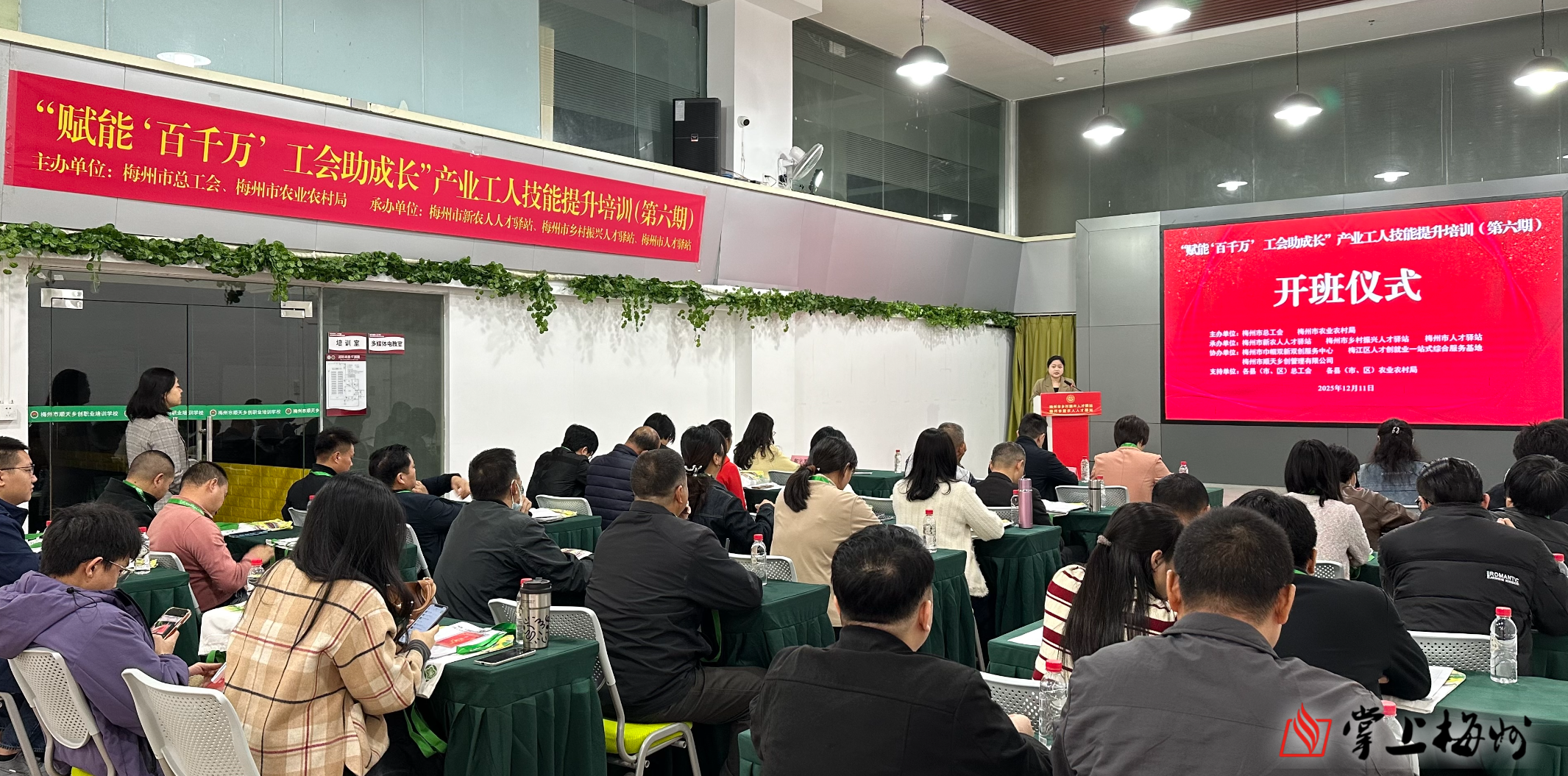 掌上梅州讯 12月11日上午,“赋能‘百千万’,工会助成长”产业工人技能提升培训(第六期)在梅州市新农人人才驿站举行开班仪式。活动由市新农人人才驿站党支部书记、执行站长郑宇芳主持。