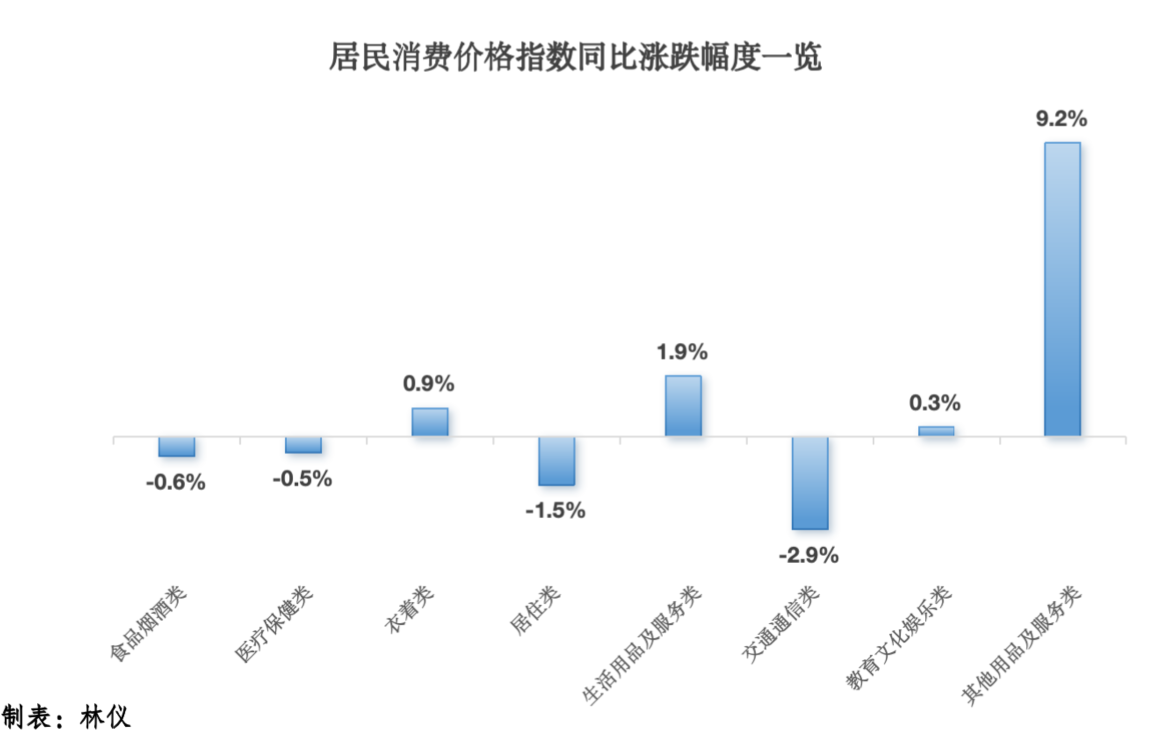 分类别看,CPI八大类商品(服务)价格环比呈“5涨3降”态势。其中,衣着价格上涨1.1%,其他用品及服务价格上涨0.6%,食品烟酒价格上涨0.4%,医疗保健、居住价格均上涨0.3%;交通通信价格下降1.0%,教育文化娱乐价格上涨0.7%,生活用品及服务价格下降0.5%。