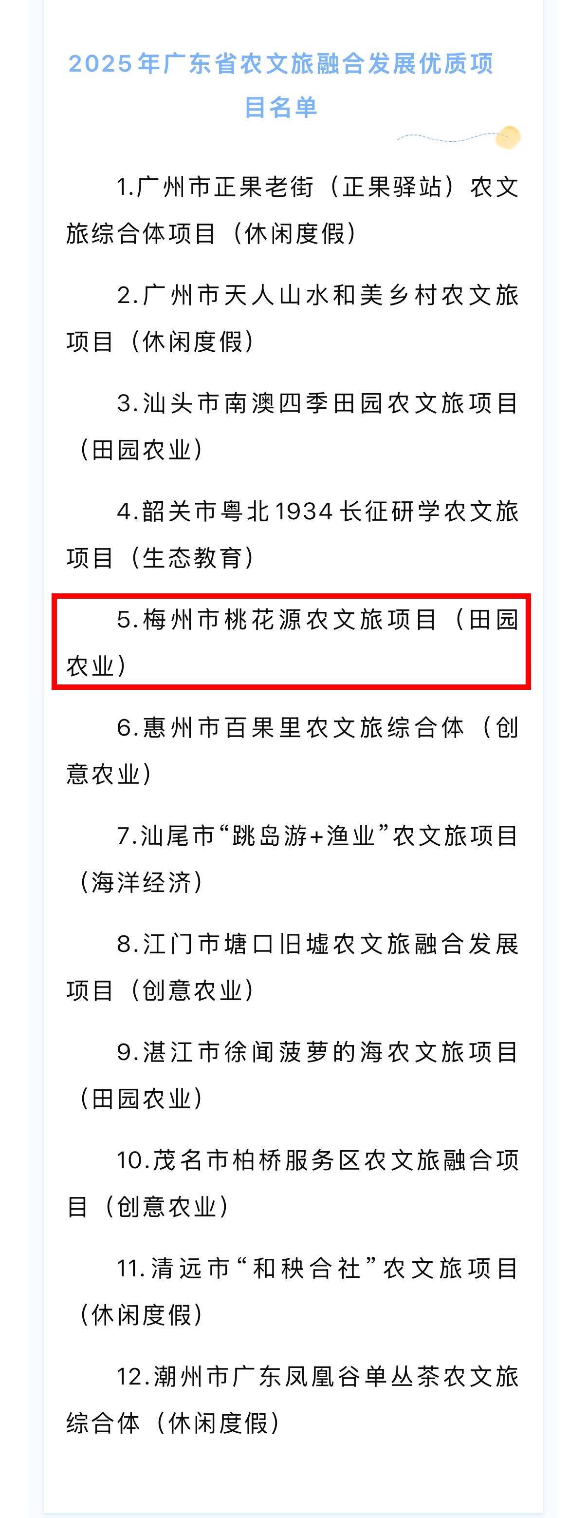 12月16日,广东省文化和旅游厅、广东省自然资源厅、广东省农业农村厅联合公布2025年农文旅融合发展优质项目名单,梅州市桃花源农文旅项目榜上有名。
