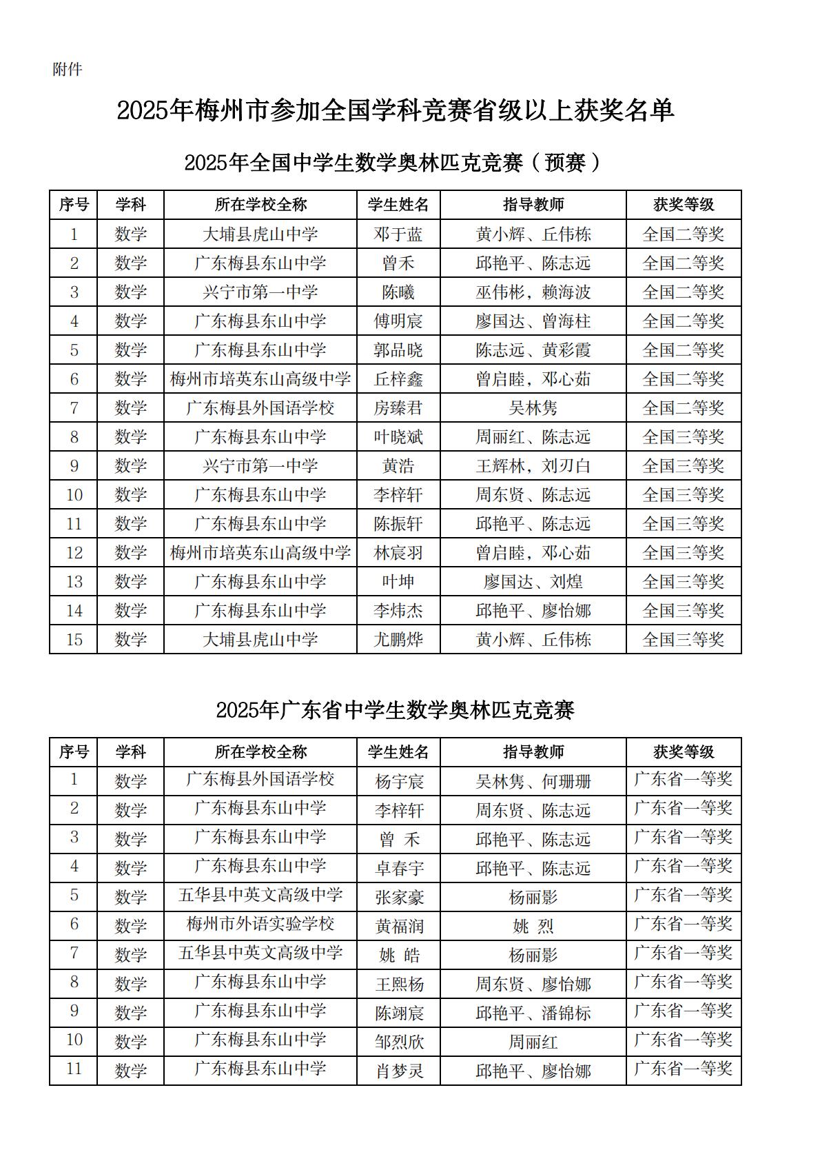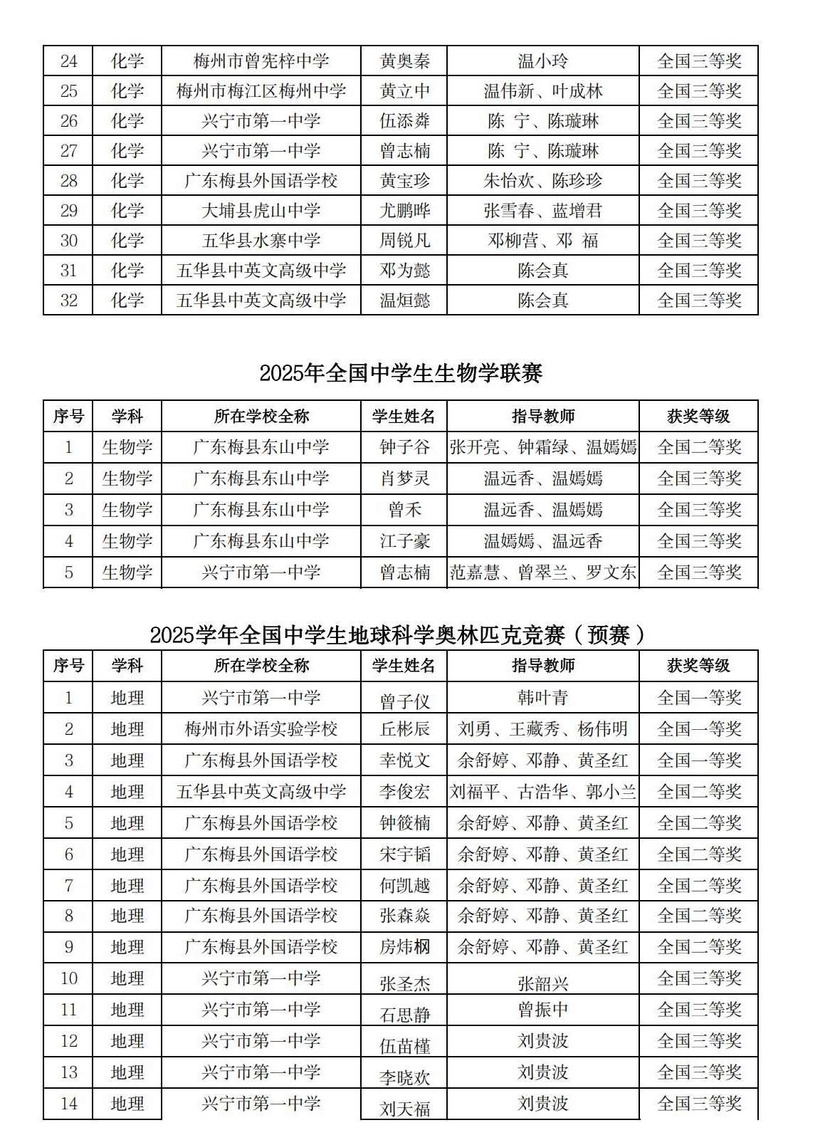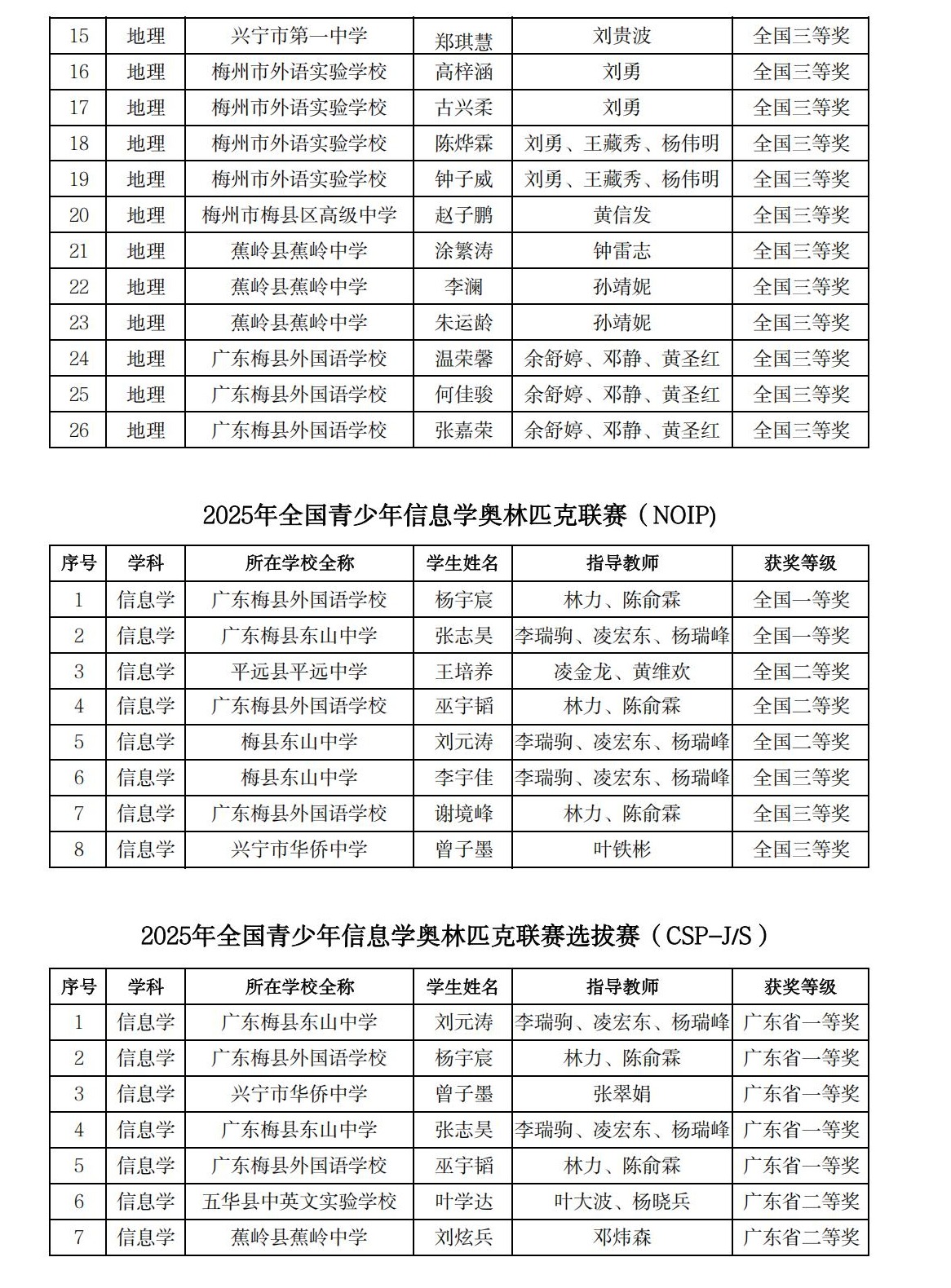 掌上梅州讯 记者从梅州市教育局获悉,2025年全国中小学生数学、物理、化学、生物学、地理、信息学奥林匹克竞赛获奖名单陆续公布。梅州市学子在奥赛中表现出色,获得国家级一等奖5人,国家级二等奖25人,国家级三等奖62人,省级一等奖18人,省级二等奖40人,省级三等奖78人。