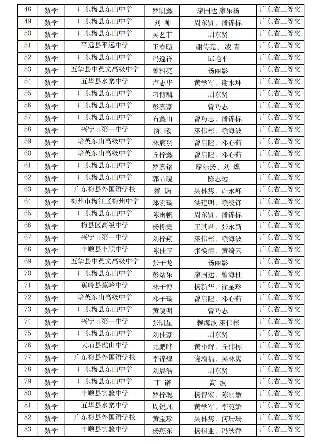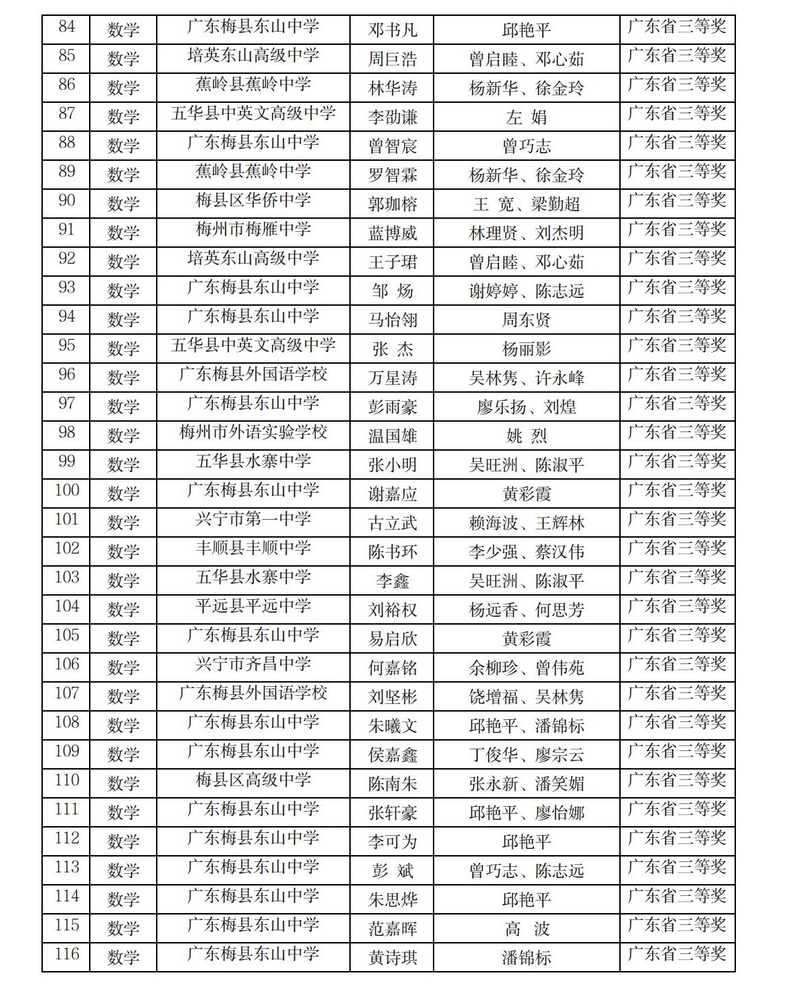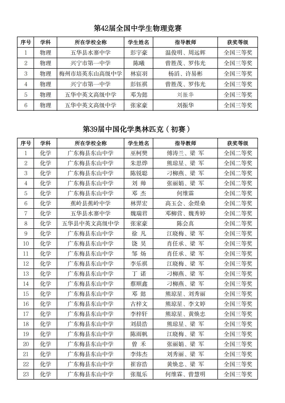 掌上梅州讯 记者从梅州市教育局获悉,2025年全国中小学生数学、物理、化学、生物学、地理、信息学奥林匹克竞赛获奖名单陆续公布。梅州市学子在奥赛中表现出色,获得国家级一等奖5人,国家级二等奖25人,国家级三等奖62人,省级一等奖18人,省级二等奖40人,省级三等奖78人。