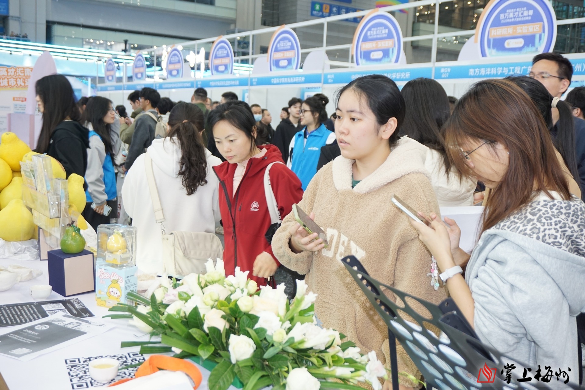 上午11时许,招聘会进入首日高峰时段,位于1号馆的梅州城市形象展区人潮涌动。展台前,金柚、脐橙等特色农产品与可爱的客家文创IP形象纷纷亮相,吸引众多目光。一旁的多媒体屏持续滚动,生动呈现着梅州的青山绿水、产业新貌、城市蓝图与引才政策,为求职者勾勒出一幅清晰的发展图景。不少人在展区驻足流连,或品尝清甜果品,或打卡记录,或仔细浏览展示内容,在沉浸式的体验中,深切感受着客都梅州的独特魅力。