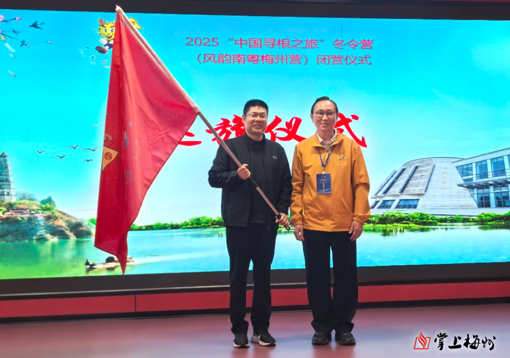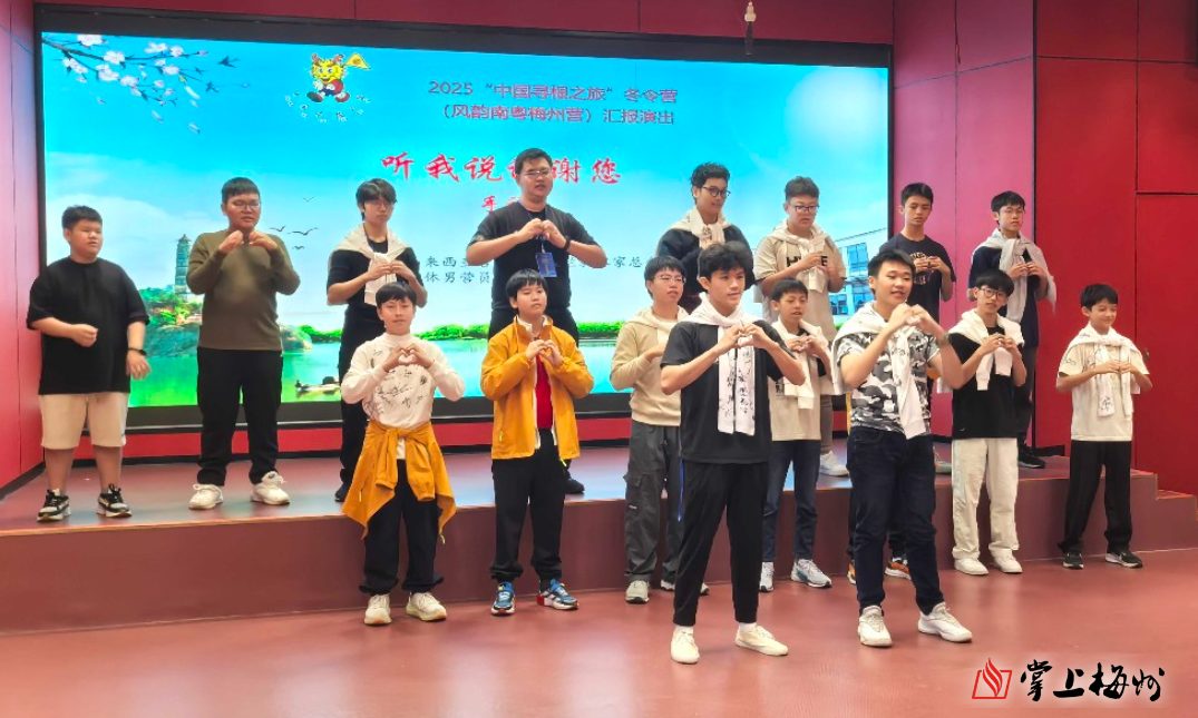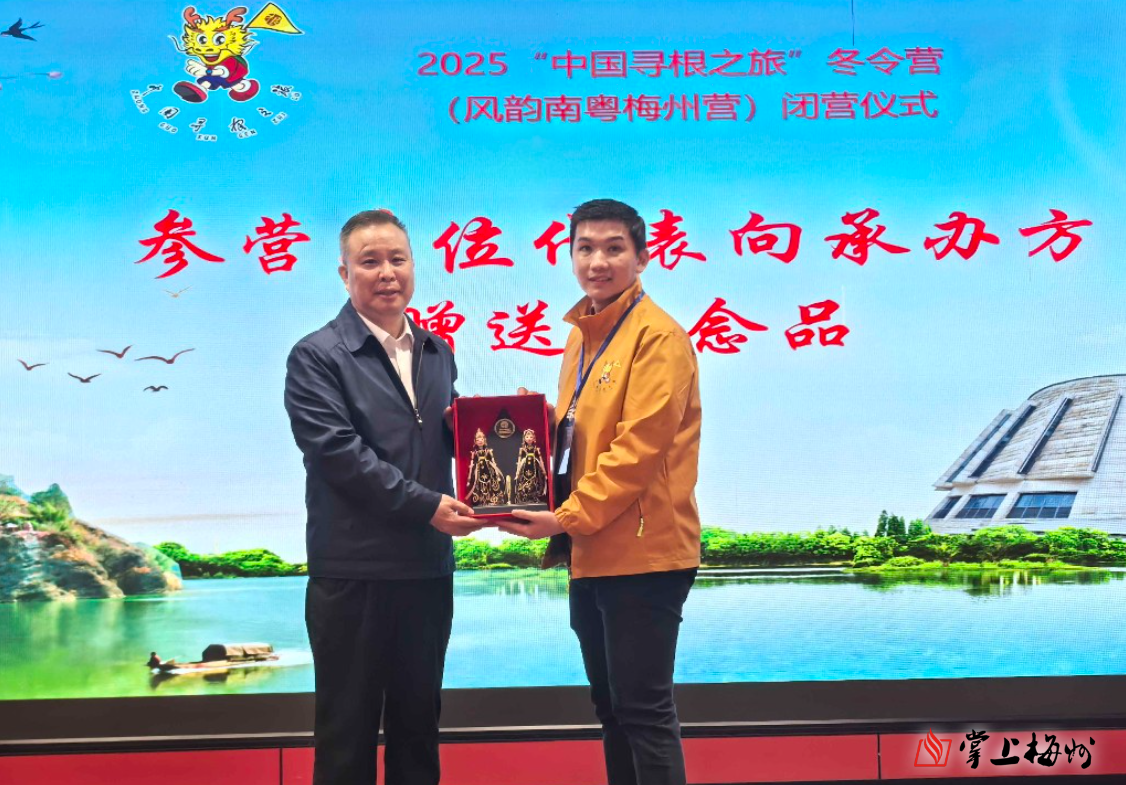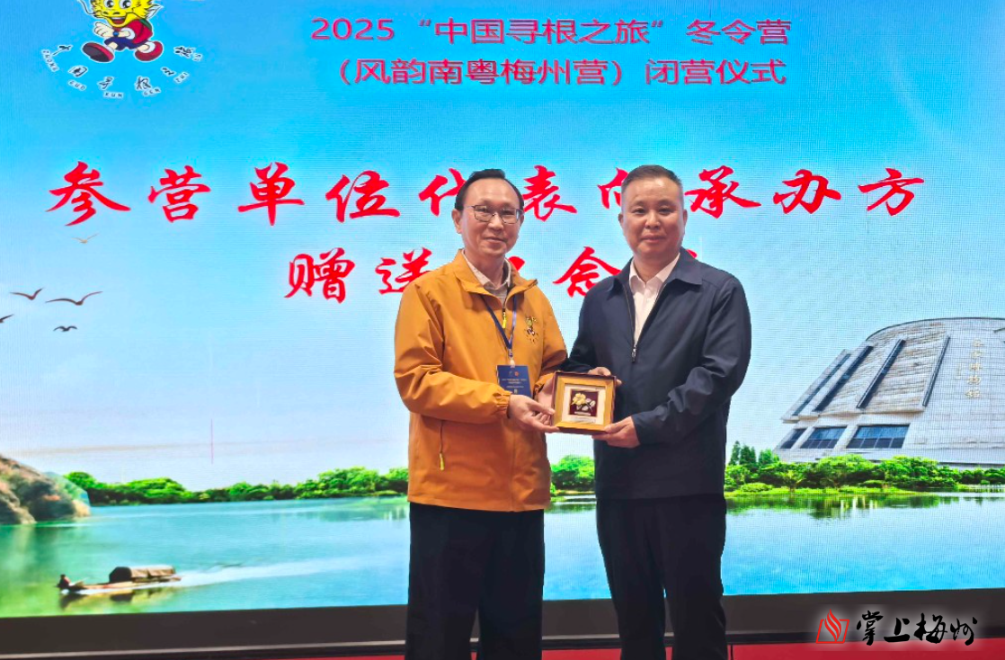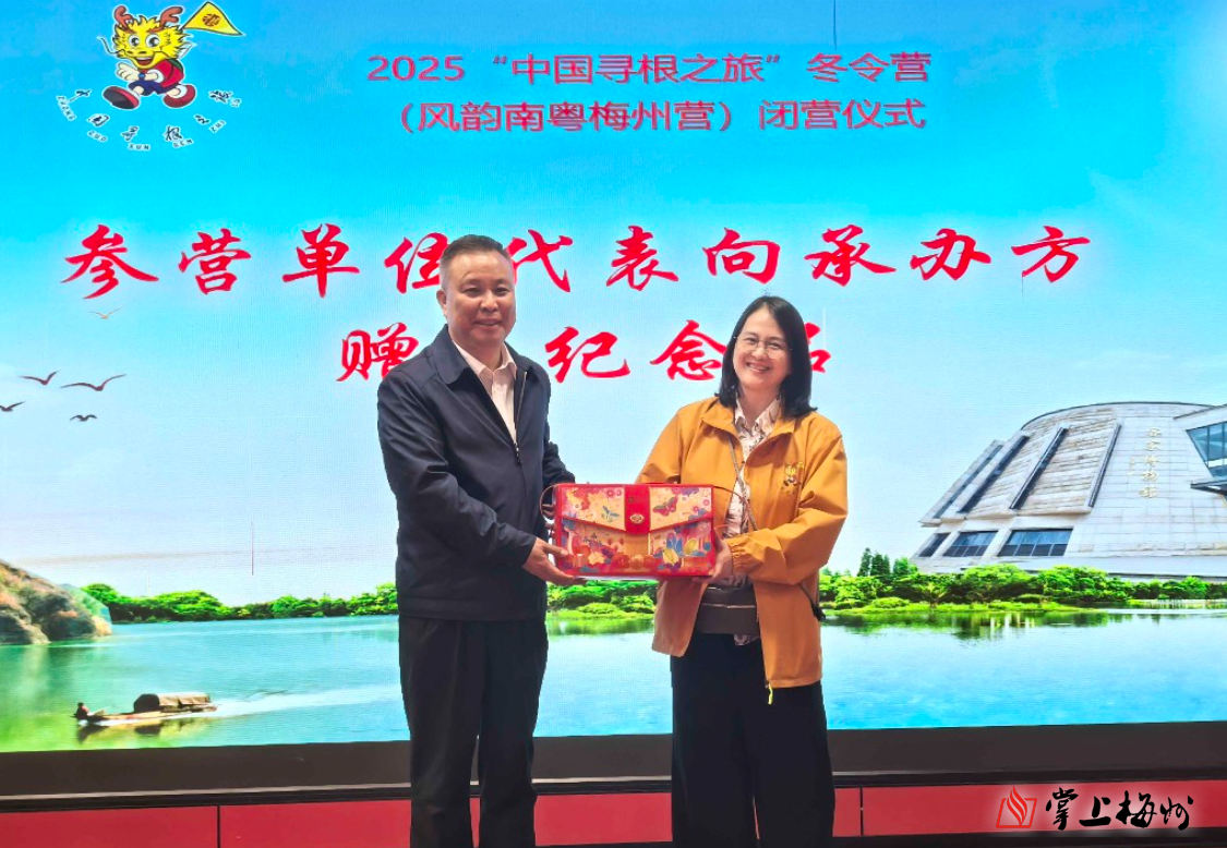 掌上梅州讯 29日下午,2025“中国寻根之旅”冬令营(风韵南粤梅州营)闭营仪式在兴宁市径南镇月形山乡村旅游区举行。为期10天的客家文化寻根之旅圆满落下帷幕,来自马来西亚吉隆坡、印尼雅加达、印尼泗水等地的华裔青少年在梅州完成了一场深度的文化体验之旅。