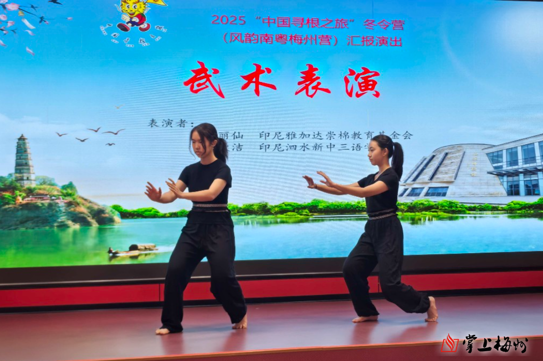 仪式上,营员们首先观看了冬令营回顾视频,重温此次寻根之旅的精彩瞬间。主持人随后宣布闭营并举行还旗仪式。省侨联兼职副主席、市侨联主席汤志平为营员颁发参营证书,并为优秀营员颁发荣誉证书。参营单位依次向承办方赠送了纪念品。汇报演出中,武术、巴厘岛占戈舞、爪哇竹马舞、二胡独奏等10个节目依次登场,各国营员的才艺表演,成为客家文化与海外多元文化交融的生动展示。