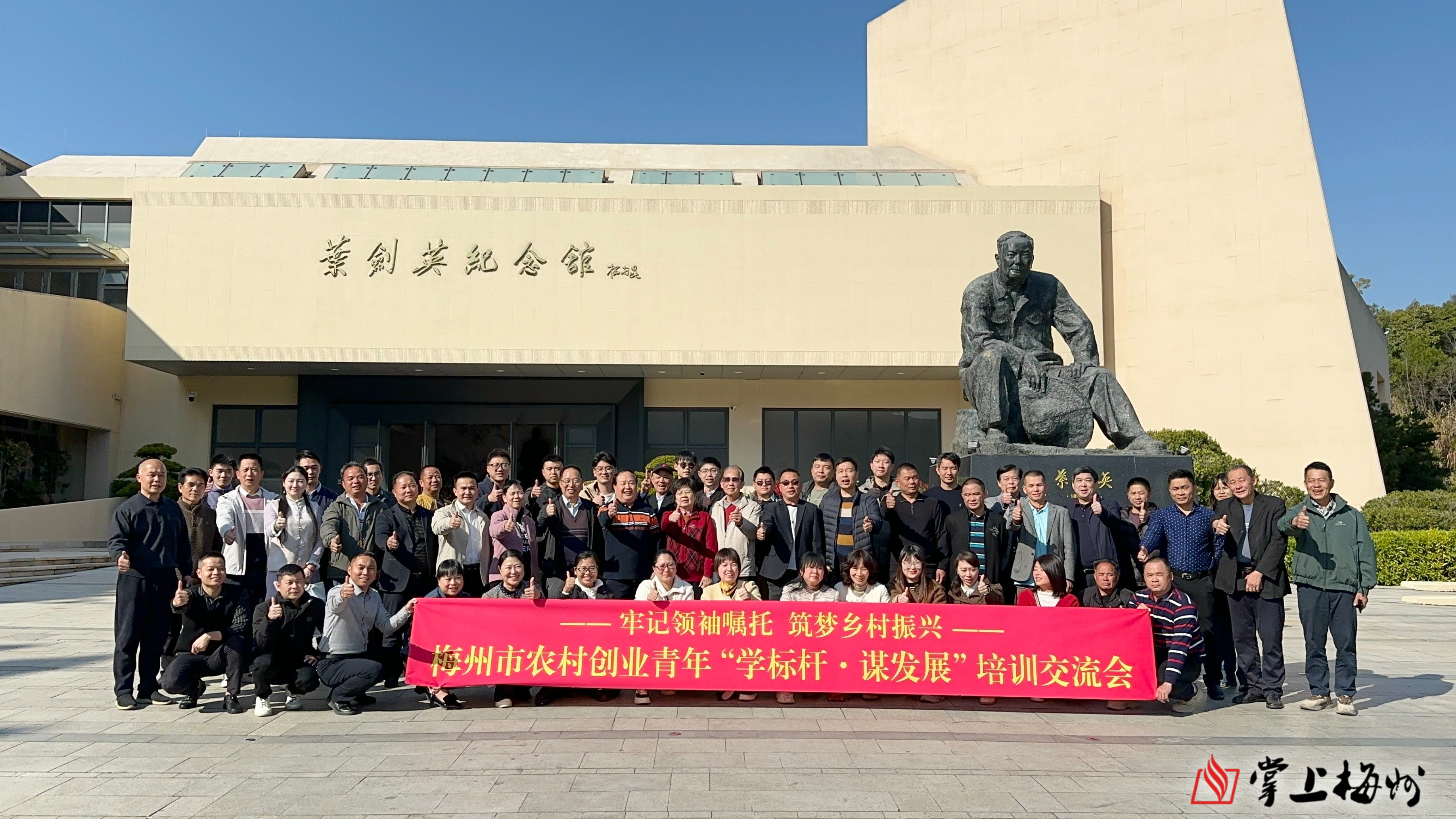 农村创业青年们先后前往叶剑英纪念园、雁洋镇南福村金柚种植基地开展实地研学。在叶剑英纪念园,大家怀着崇敬心情参观叶剑英同志生平事迹陈列馆,聆听讲解,观看史料、图片和实物,了解其不朽功勋,感悟革命先辈崇高精神与红色基因。大家纷纷表示,要从红色历史中汲取奋进力量,转化为投身乡村振兴的强大动力。在雁洋镇南福村金柚种植基地,大家实地考察金柚产业模式,学习“支部+合作社+基地+农户”运营经验,观摩深加工生产线及农文旅融合项目,交流“乡村特色产业强链延链补链”的有效路径。
