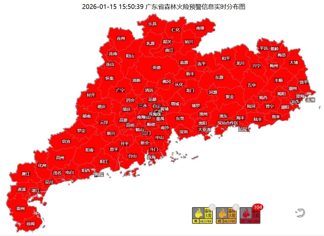 全省共有104个森林火险红色预警信号正在生效中