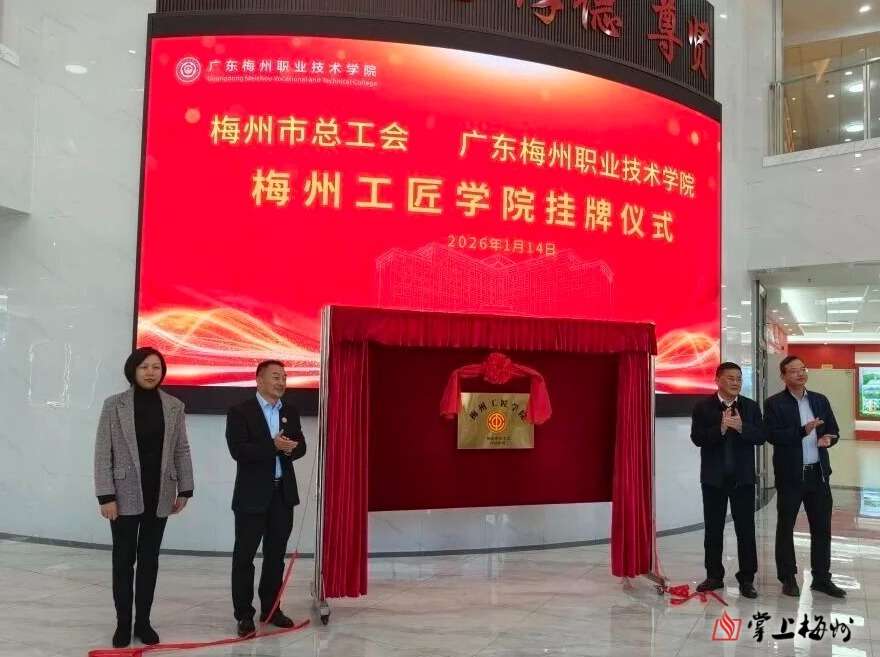 掌上梅州讯 1月14日,梅州第二家市级工匠学院——“梅州工匠学院”在广东梅州职业技术学院广梅园校区正式揭牌。这是市总工会深入贯彻落实党中央、国务院及广东省关于深化产业工人队伍建设改革相关精神的重要举措,标志着梅州在产教融合、培育高素质技能人才领域迈出关键一步,为苏区振兴发展注入强劲技能动能。