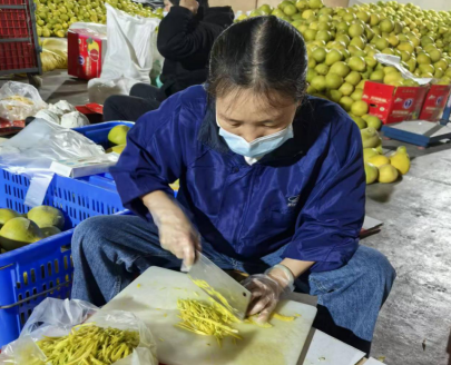 发动劳力,初加工在村。组织村里留守的妇女、老人,以手工物理方式分解柚子,取皮切片、取肉打包,将初加工环节留在村里,增加村民就近就业收入。