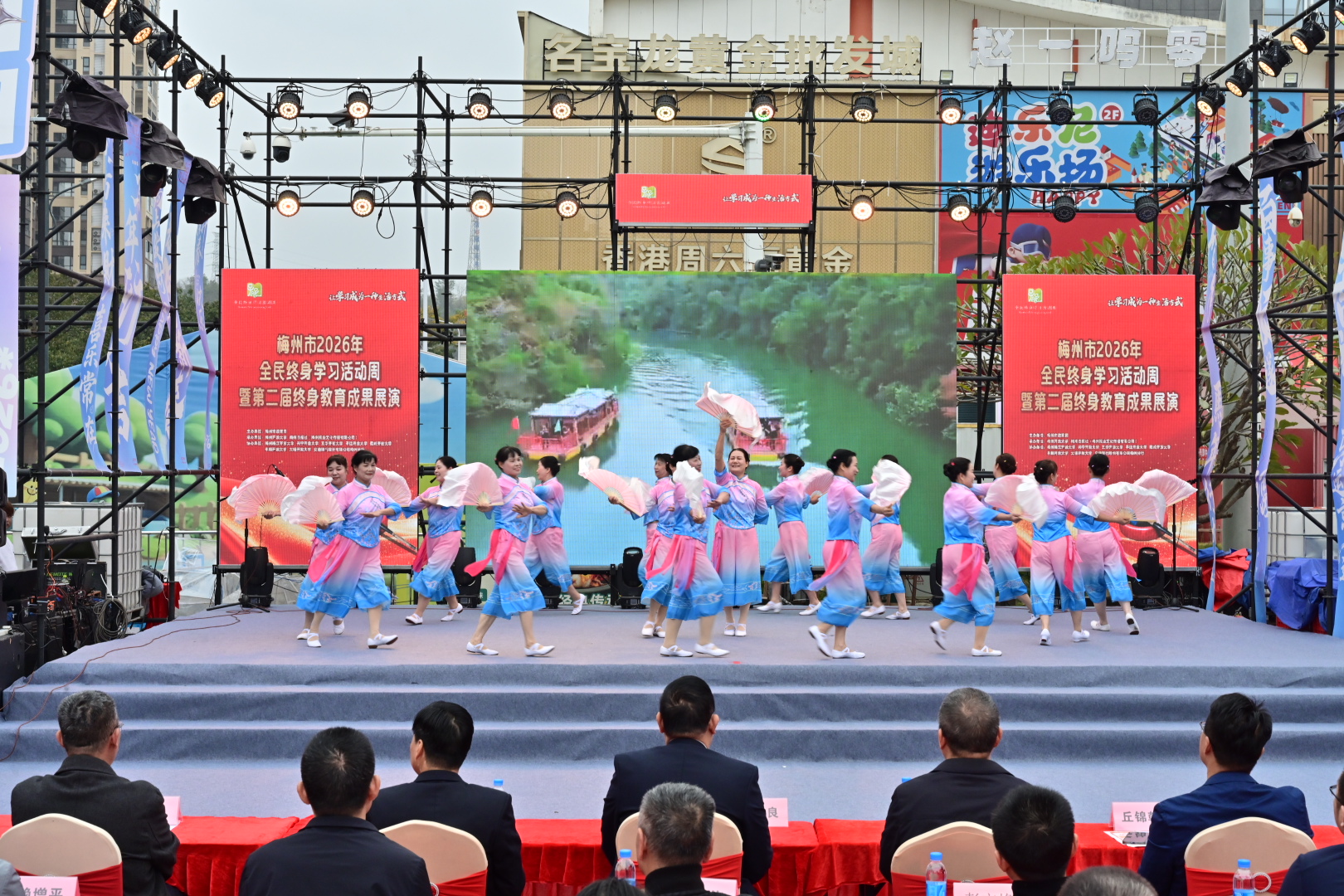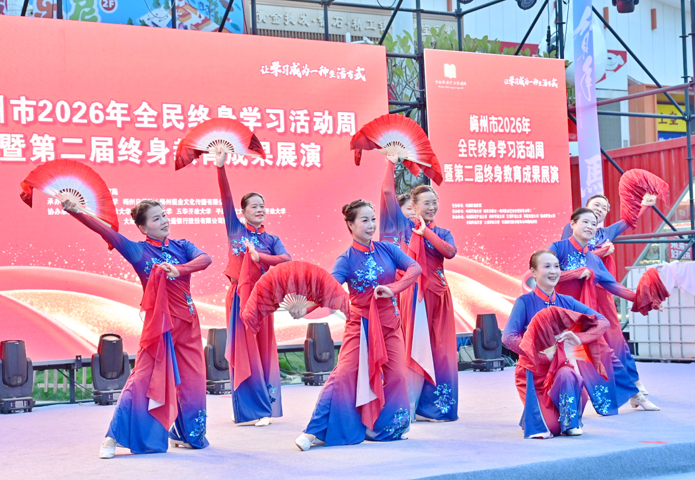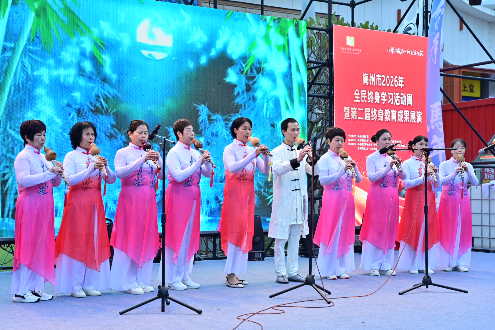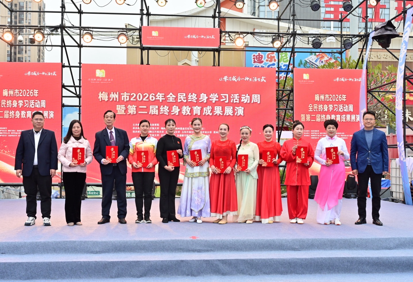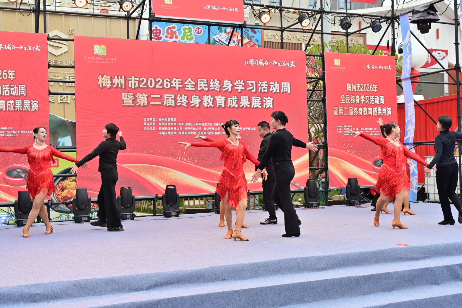 掌上梅州讯 1月20日下午,以“让学习成为一种生活方式”为主题的梅州市2026年全民终身学习活动周暨第二届终身教育成果展演活动在梅江区万达广场举行。市教育局党组成员、副局长钟文,梅州开放大学党总支书记、校长罗金良,梅州日报社党委副书记、总经理丘锦乾,梅州市委社会工作部副部长、三级调研员曾宪鑫,梅州市妇联党组成员、副主席陈春妮等领导嘉宾出席开幕式。