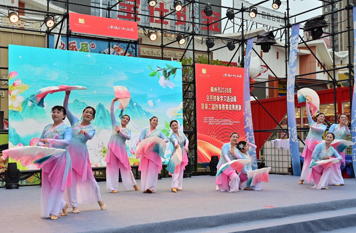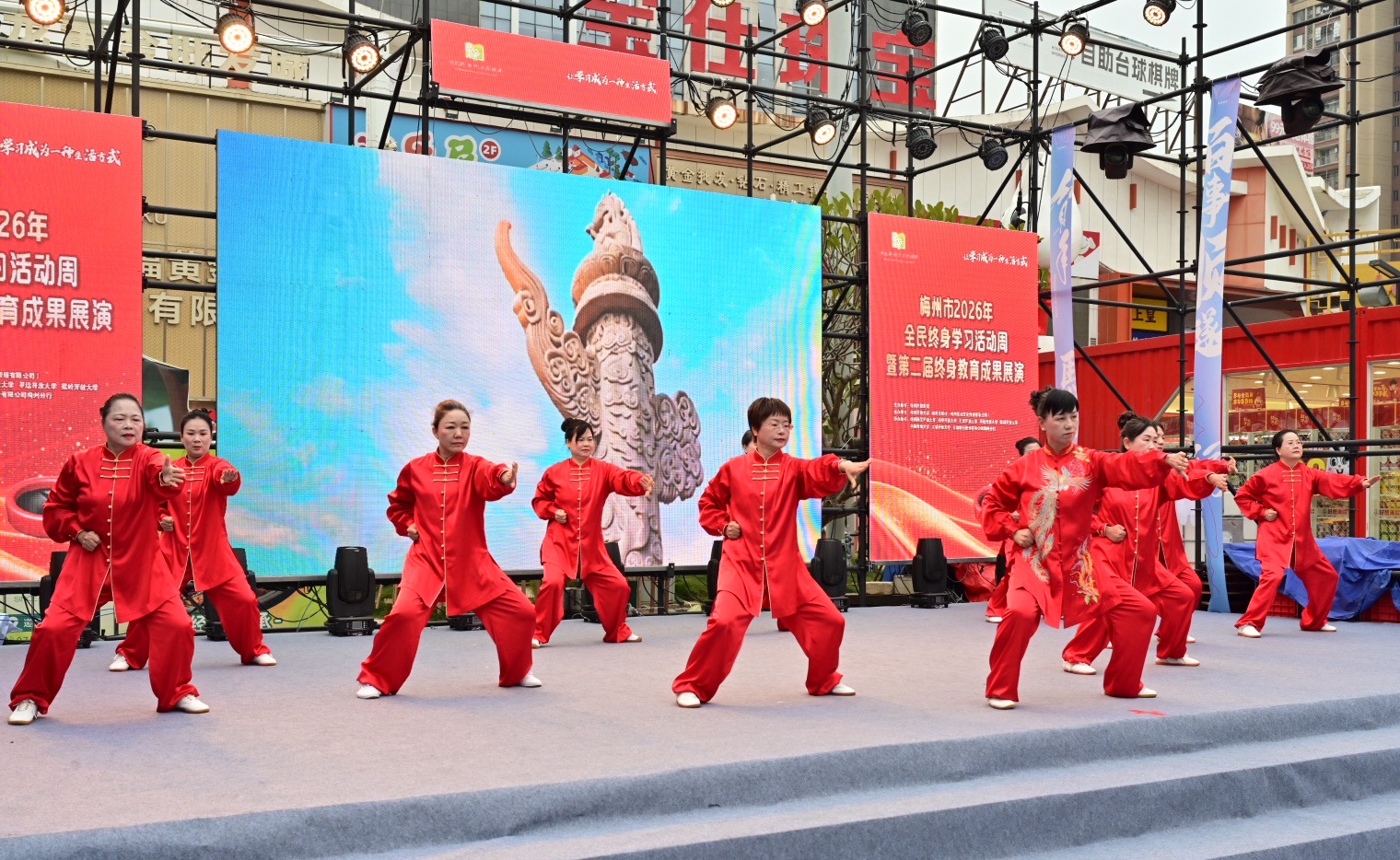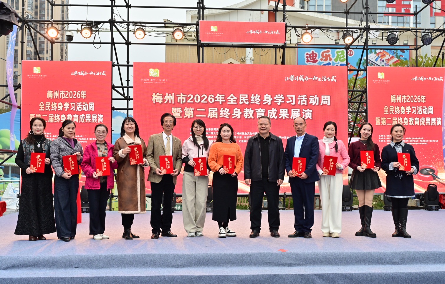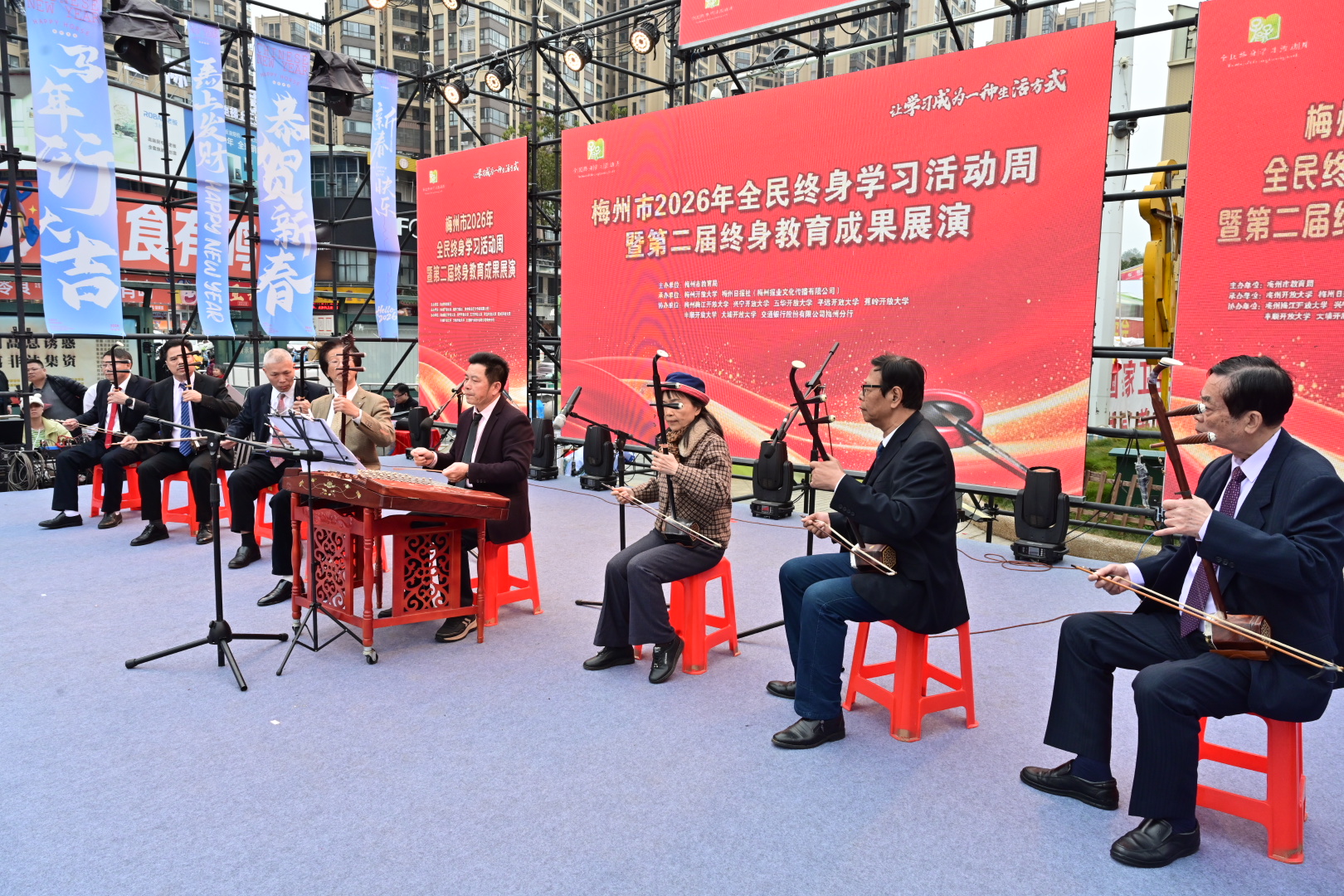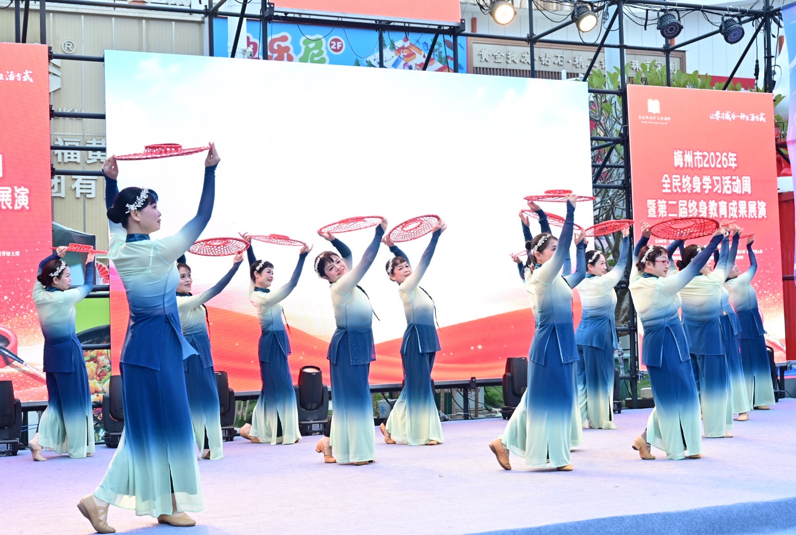 掌上梅州讯 1月20日下午,以“让学习成为一种生活方式”为主题的梅州市2026年全民终身学习活动周暨第二届终身教育成果展演活动在梅江区万达广场举行。市教育局党组成员、副局长钟文,梅州开放大学党总支书记、校长罗金良,梅州日报社党委副书记、总经理丘锦乾,梅州市委社会工作部副部长、三级调研员曾宪鑫,梅州市妇联党组成员、副主席陈春妮等领导嘉宾出席开幕式。
