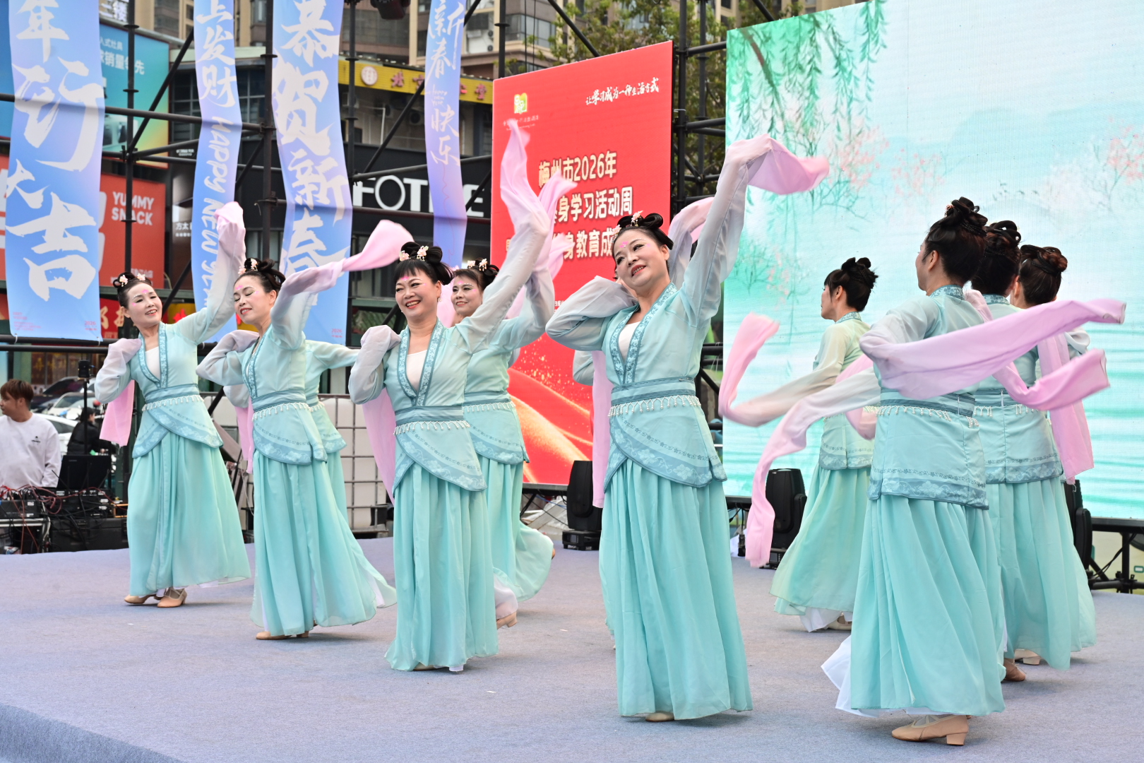 活动现场,22个精心编排的节目轮番登台,为现场观众带来了一场视听盛宴。广东汉乐丝弦乐《落地金钱》悠扬婉转,尽显客家传统文化的独特魅力;舞蹈《在希望的田野上》舞姿优美,展现了对生活的热爱与对未来的憧憬;健身气功《四十二式太极拳》刚柔并济;古典舞《千里江山图》意境悠远,仿佛带领观众穿越时空领略壮丽山河;五句板《虚玄歌子万万千》充满地道客家韵味,展现了民间艺术的无穷魅力。此外,吉特巴舞《搀扶》欢快又有节奏,二胡歌曲联奏《名曲联奏》余音绕梁,古典舞《光亮》彰显光的温暖与希望,群口快板《勤劳致富张阿香》节奏明快、传递正能量,旗袍国风《又见梅花绣》尽显东方神韵,一系列节目涵盖传统器乐、现代舞蹈、群口快板等多种艺术形式,将客家文化传承与终身学习理念深度融合,赢得了现场观众的阵阵掌声。