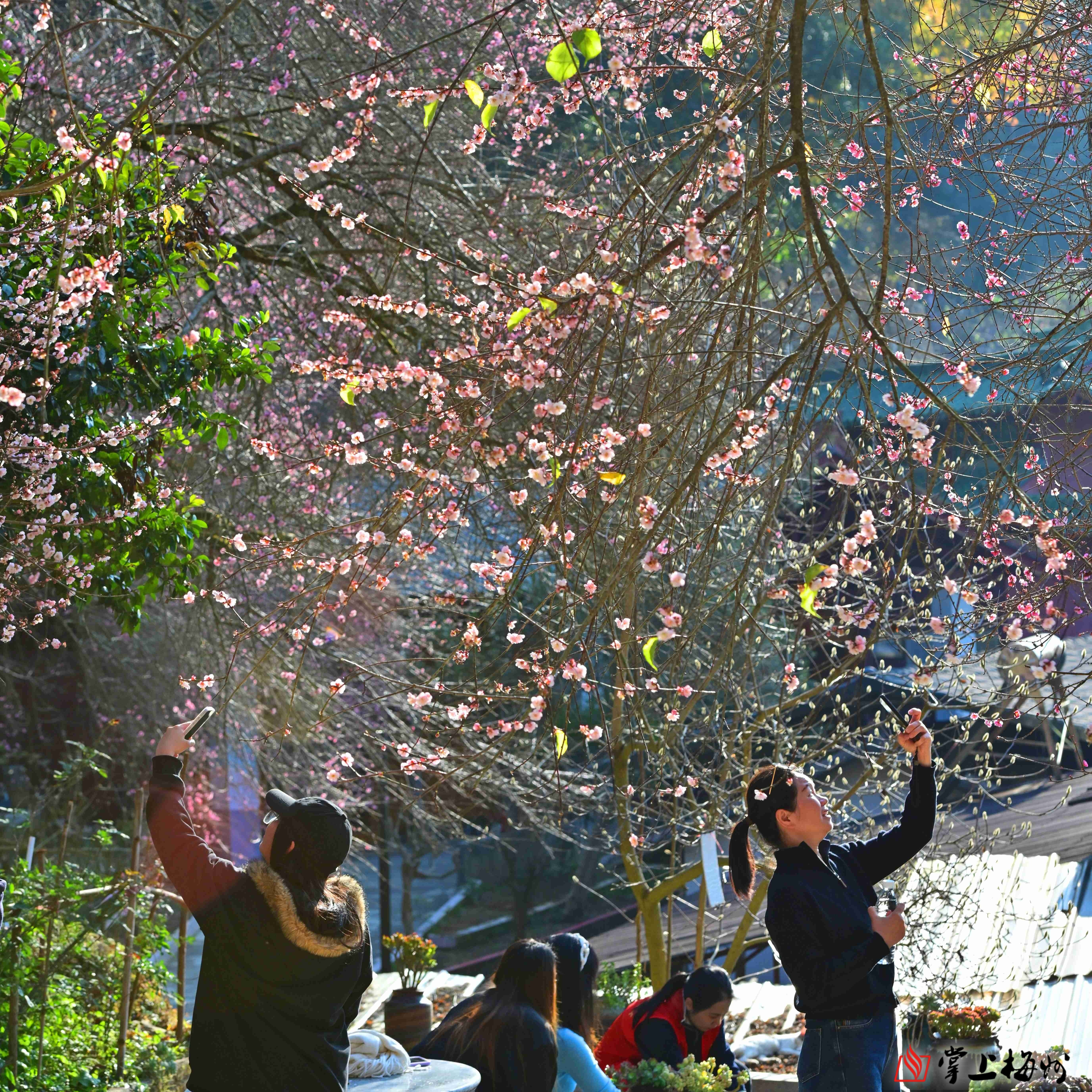 潮塘古梅盛情绽放,吸引众多游客前来赏梅打卡。